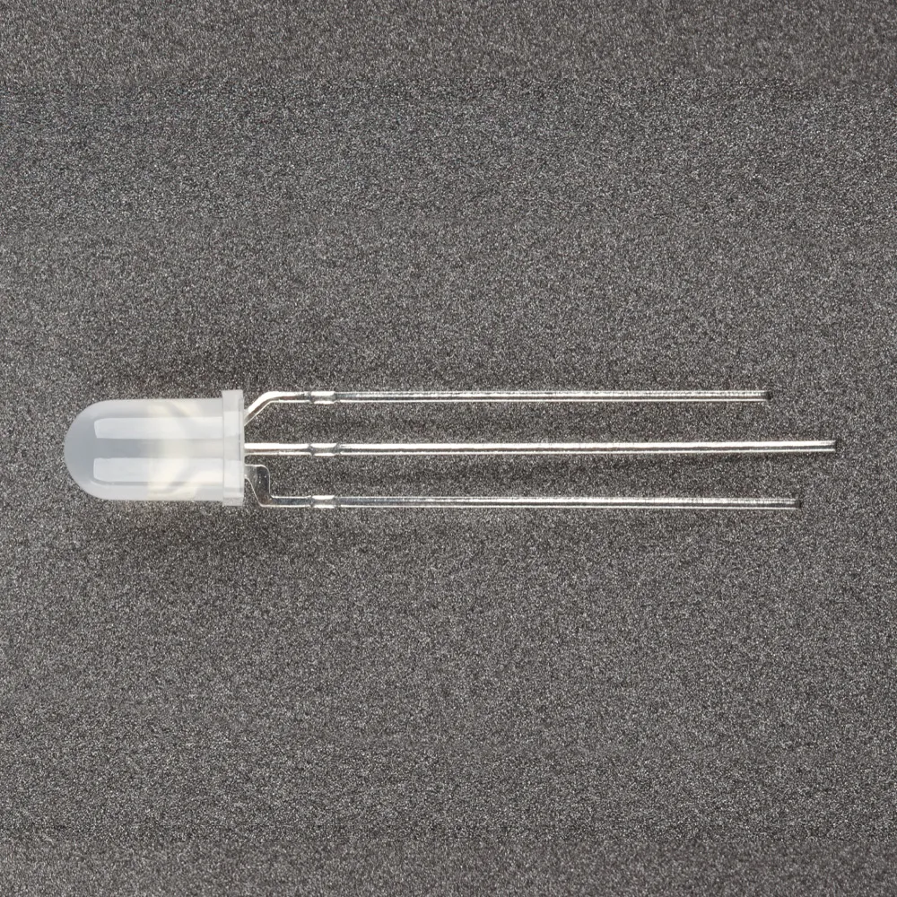 Поставка под заказ от 5000 шт. Выводной круглый светодиод, d=5 мм, белая матовая линза. Цвет свечения красный (625 нм), зеленый (565 нм). Угол излучения 30°. Сила света Iv=100-200 мкд при If=20 мА. VF=1.8-2.4 В. Три вывода, общий катод.