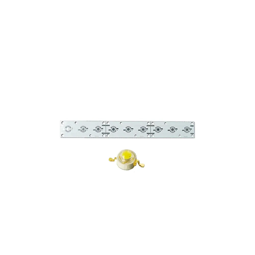 Алюминиевая плата. Размеры 240×30 мм (разделяется на три платы 80×30 мм). Цвет белый. Для 9-ти (параллельно по 3) мощных светодиодов типа Emitter. Под блочную линзу 3LB30, 3LB50.