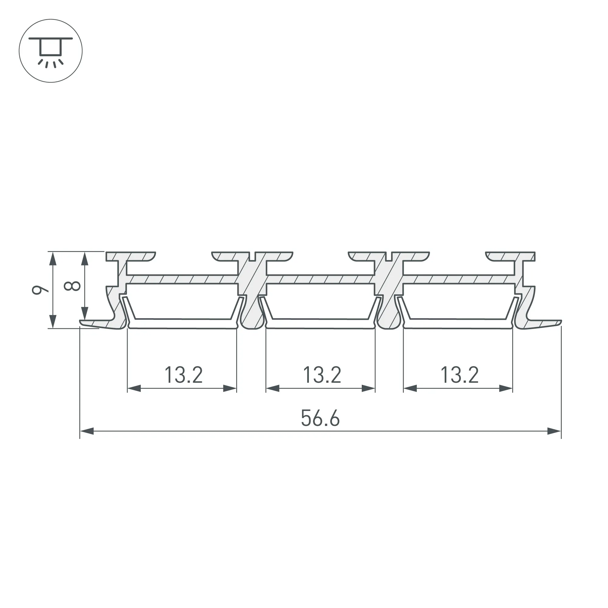 Алюминиевый анодированный тройной литой микропрофиль с фланцем (триада), без экрана, для 3-х светодиодных лент, линеек. Может использоваться с матовым или прозрачным экраном (рассеивателем). Размер 2000х56.6х9мм