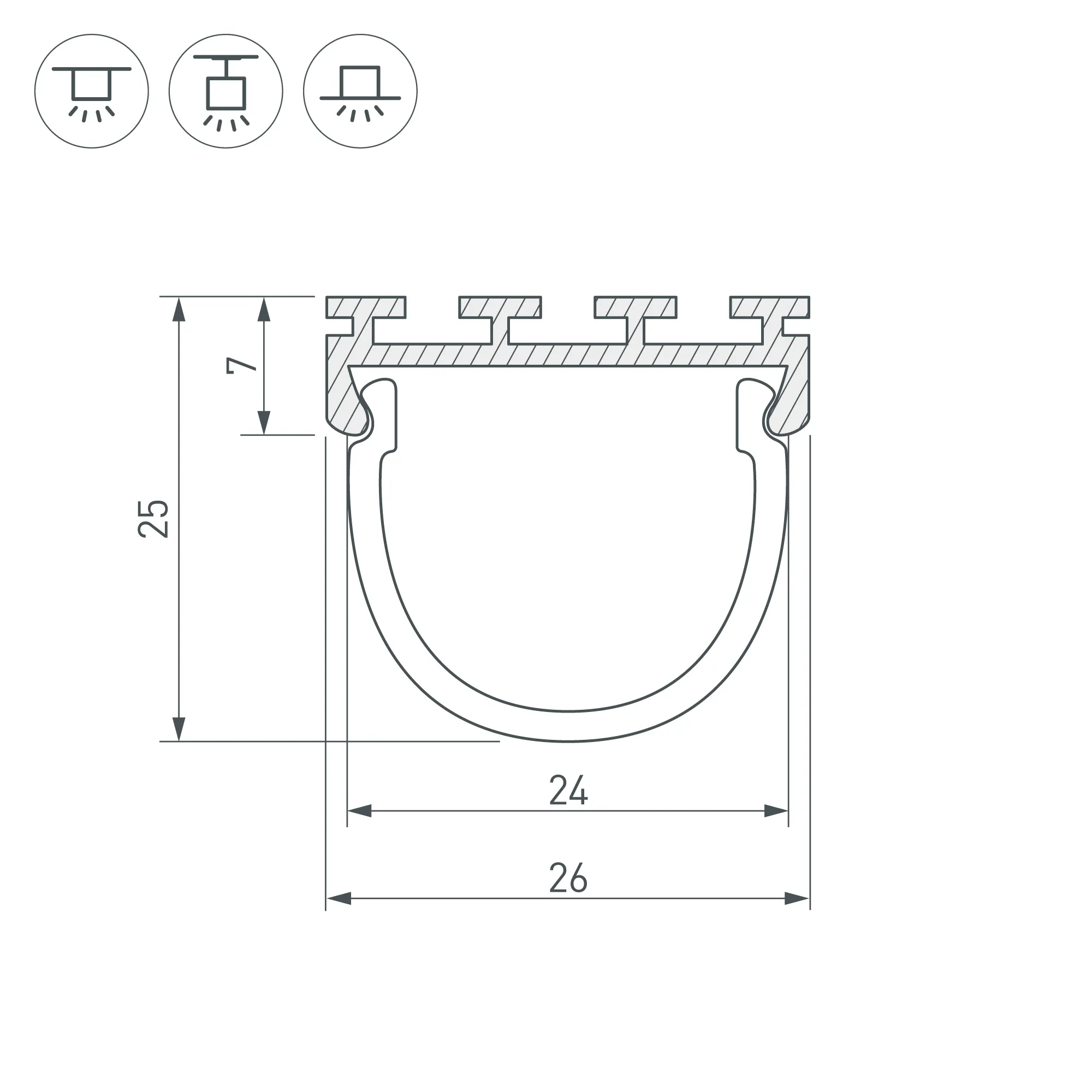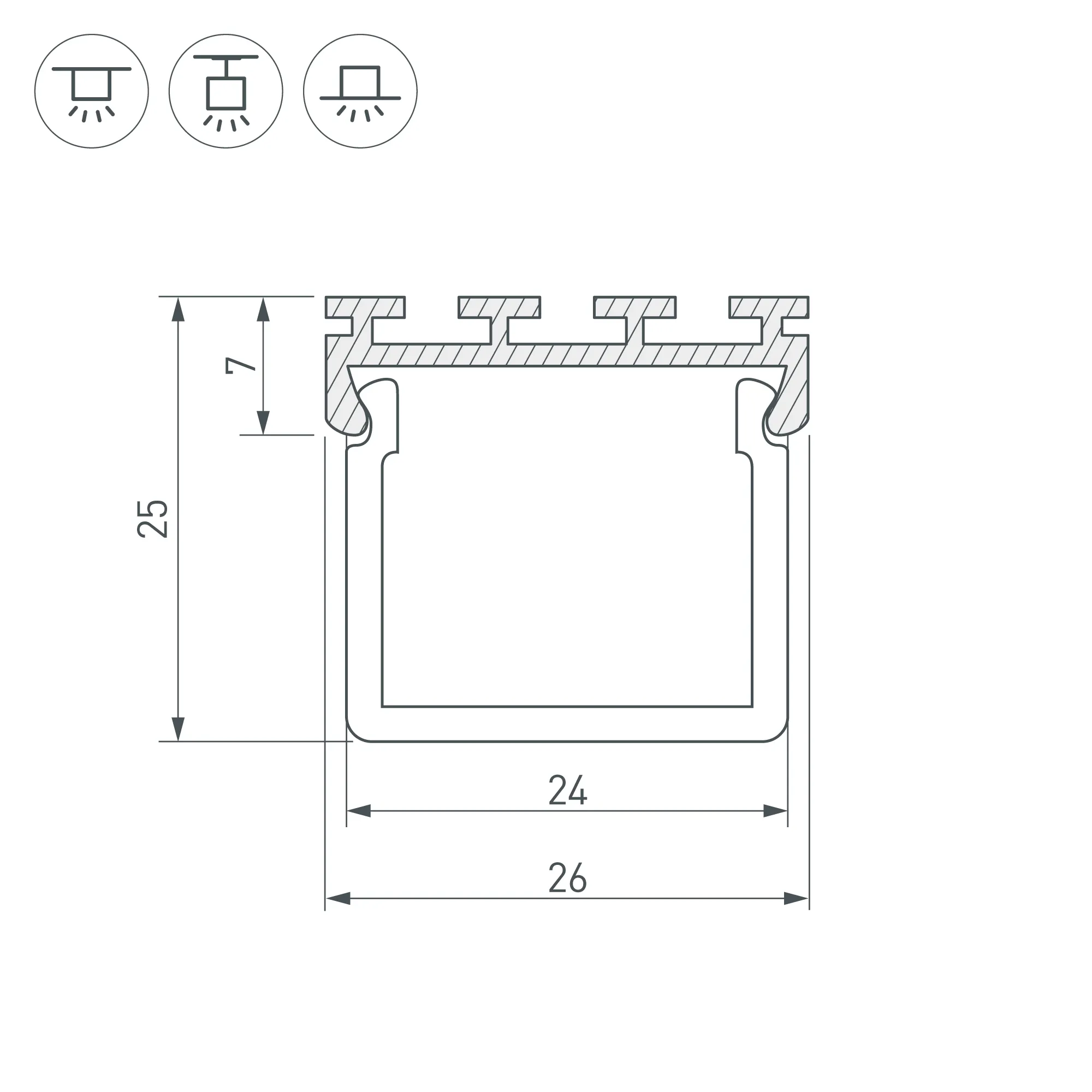 Алюминиевый анодированный широкий профиль. Подходят объемные экраны круглый G-L, квадратный G-K. Крепление на поверхности пружинами PLS-GIP/LOCK. Встраивается в профиль-держатель TEK-PLS. Размеры 2000х26.2х7.5мм. Для 2-х лент общей шириной до 19 мм.