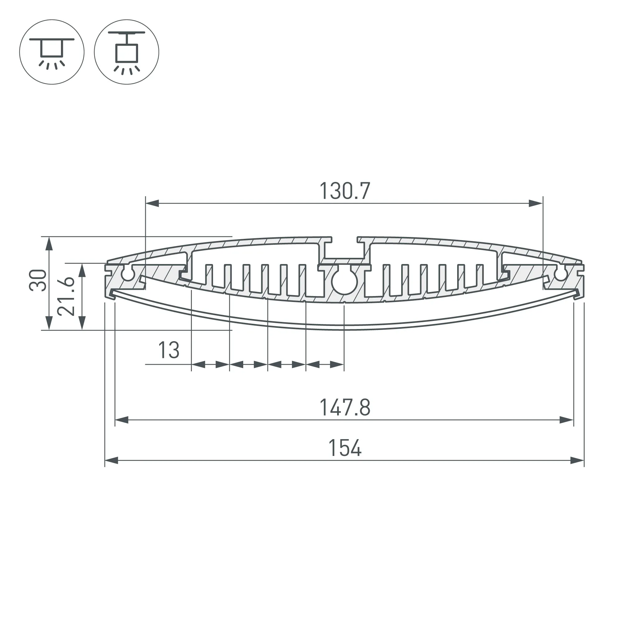 Алюминиевый анодированный широкий профиль для светодиодных лент и линеек. Габаритные размеры (L×W×H): 2000x154x21,6 мм. Ширина площадки для ленты 130 мм., макс.мощность до 50Вт/1м. Экраны, заглушки и другие аксессуары приобретаются отдельно. Цена за 1 метр.