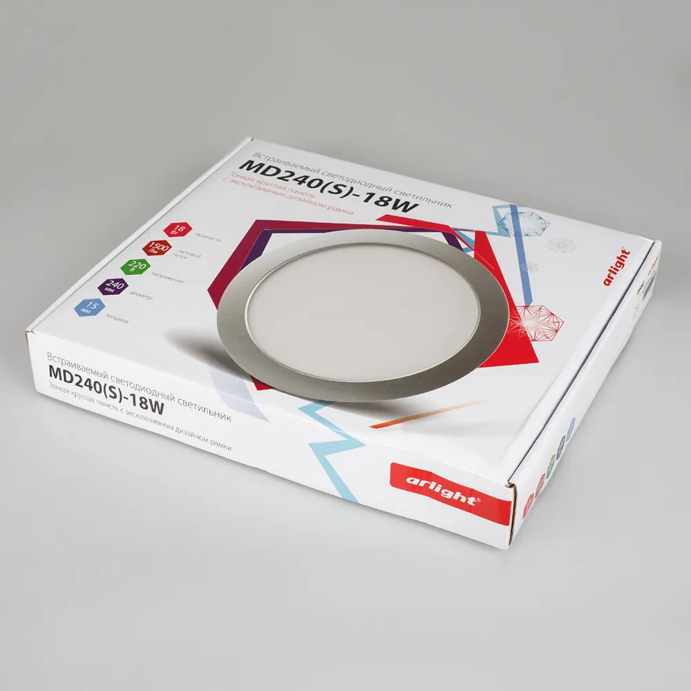 Тонкая круглая панель с эксклюзивным дизайном рамки. Цвет корпуса - серебро. Мощность 18Вт. Цвет свечения БЕЛЫЙ 6000K. Световой поток 1260-1500 лм. Угол 120°. Размер Ф240 x 15мм, установка в отверстие 230мм. Питание от сети 220VAC, драйвер в комплекте (DC870mA, 18-22V).
