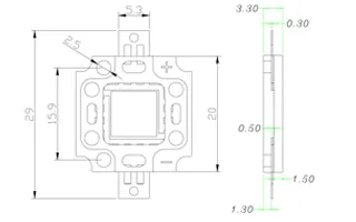 Мощный светодиод, размер 29×20×3,3 мм, светящая область 10×10 мм. Цвет свечения белый (6000-6500 К). Угол 120°. Световой поток 800 лм при If=350 мА, P=10 Вт. VF=28-33 В. CRI>70.
