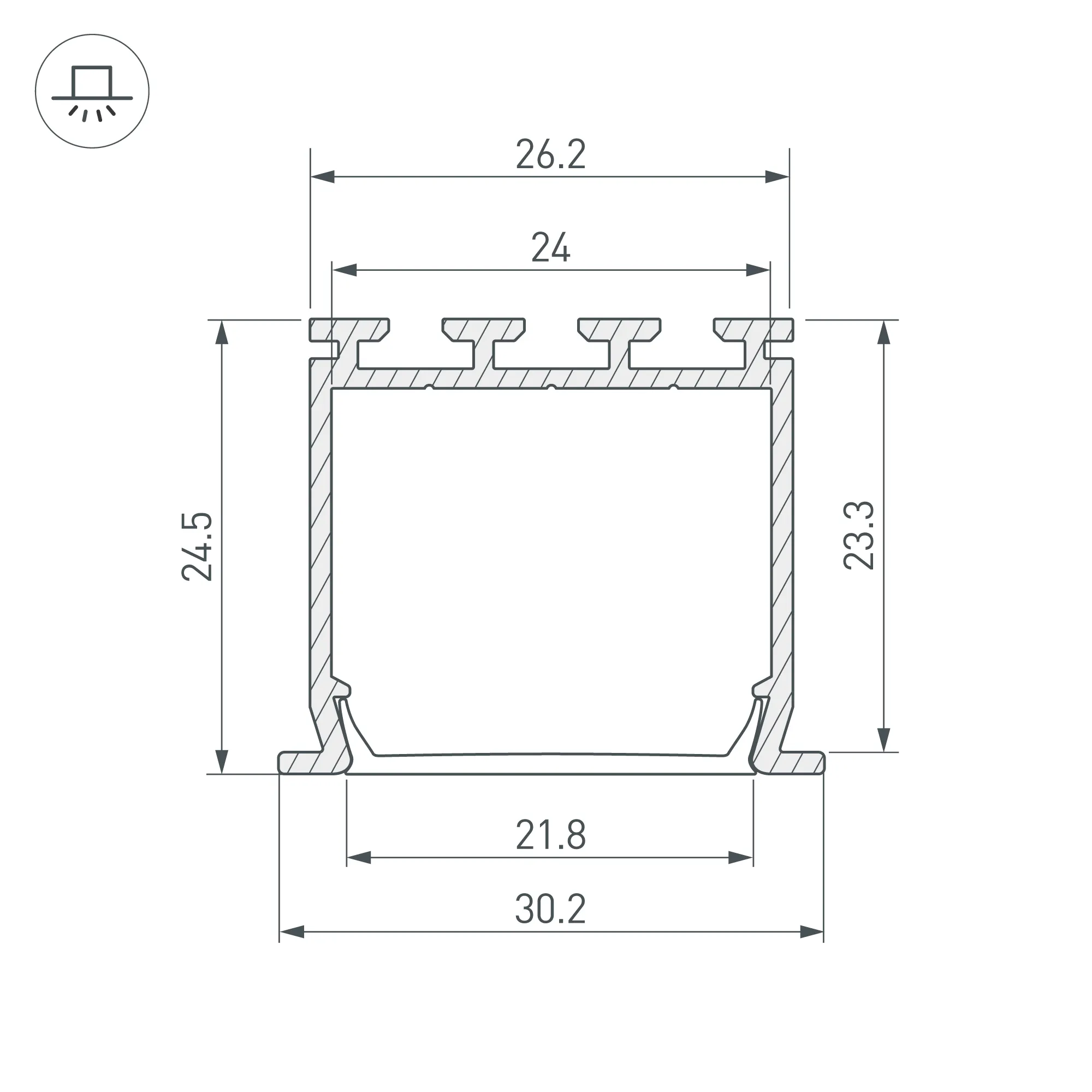 Алюминиевый анодированный встраиваемый профиль для светодиодных лент и линеек. Габаритные размеры (L×W×H): 2000x30x25 мм. Ширина площадки для ленты 24 мм. Экраны, заглушки и другие аксессуары приобретаются отдельно. Цена за 1 метр.