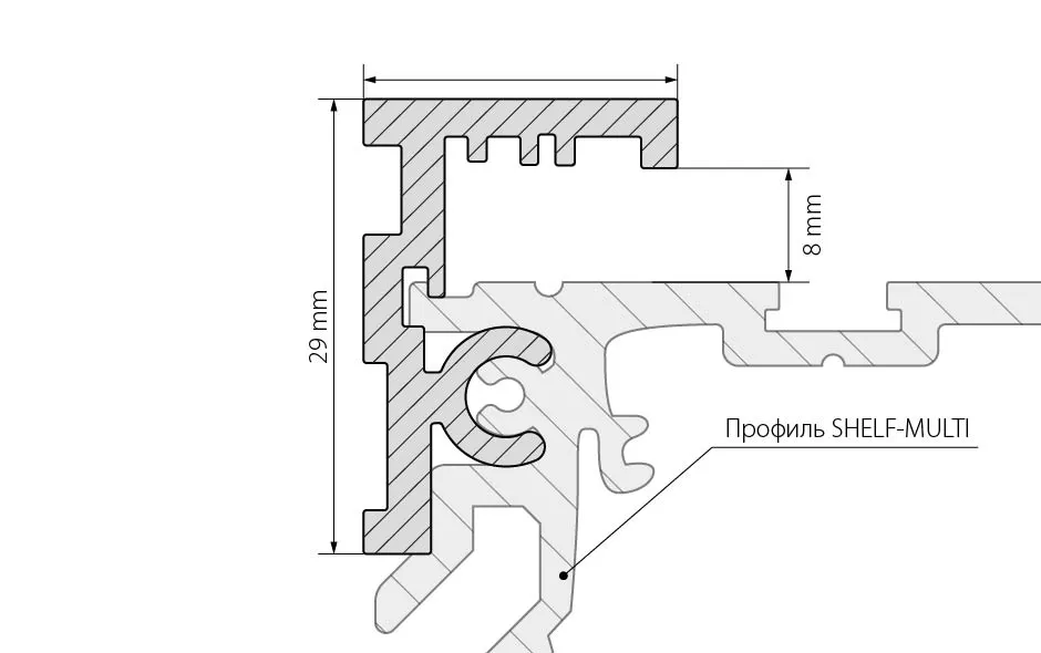 Фиксирующий анодированный профиль для стекла 8мм к профилю SHELF-MULTI, для создания полок и подставок на основе профиля SHELF-MULTI. Размеры 2000х20х29 мм.