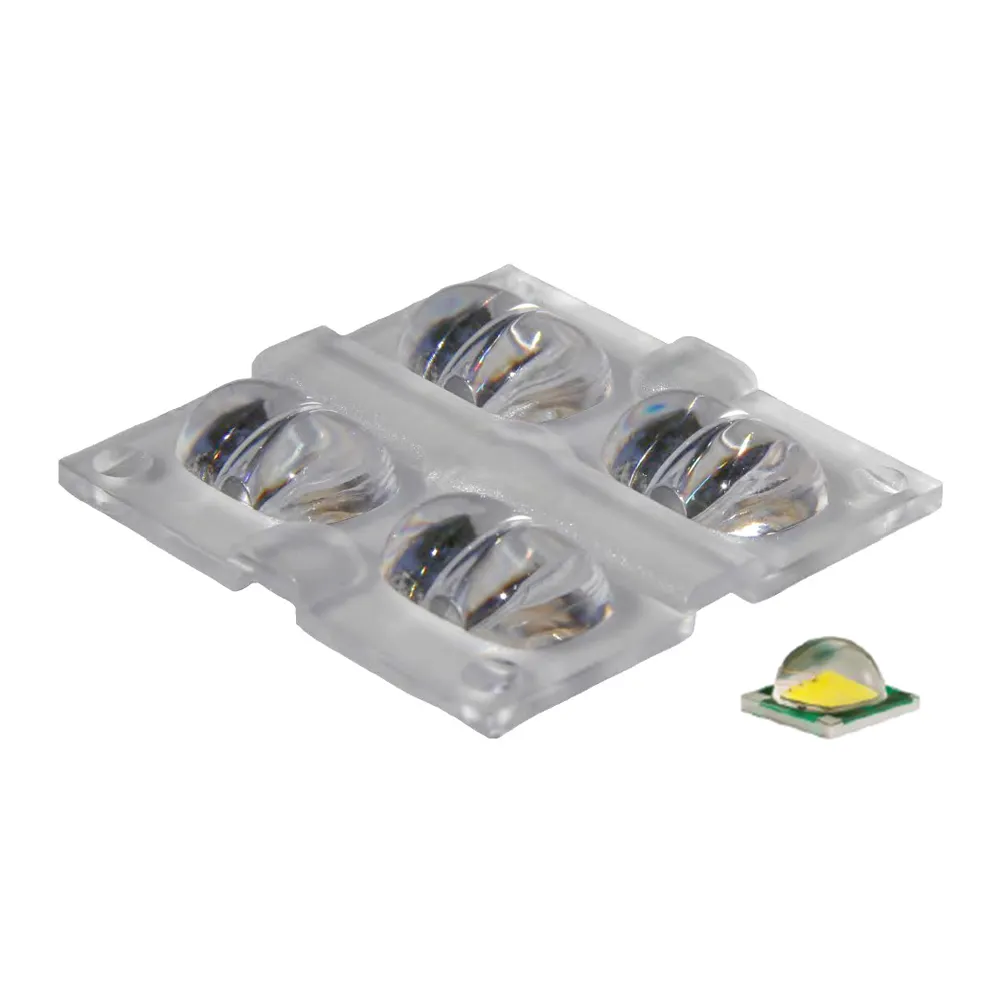 Блочная линза для мощных светодиодов CREE XP, Seoul, SMD3535, угол обзора: вертикальный 60°, горизонтальный 130°, прозрачная линза. Материал PMMA, количество светодиодов на плате: 4. Длина 52 мм, ширина 52 мм, высота 8 мм.