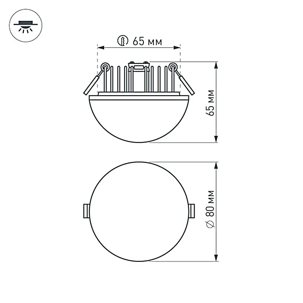 Встраиваемый светильник полусфера, 5Вт, корпус белый алюминий + глянцевый акрил. Цвет ДНЕВНОЙ БЕЛЫЙ 4000K, св.поток 400лм, CRI(Ra)>80, угол 120°. Размер Ф80x65мм, установка в отверстие Ф65мм. Питание 110-240VAC, 5Вт, 300mA 15-18V, драйвер в комплекте.
