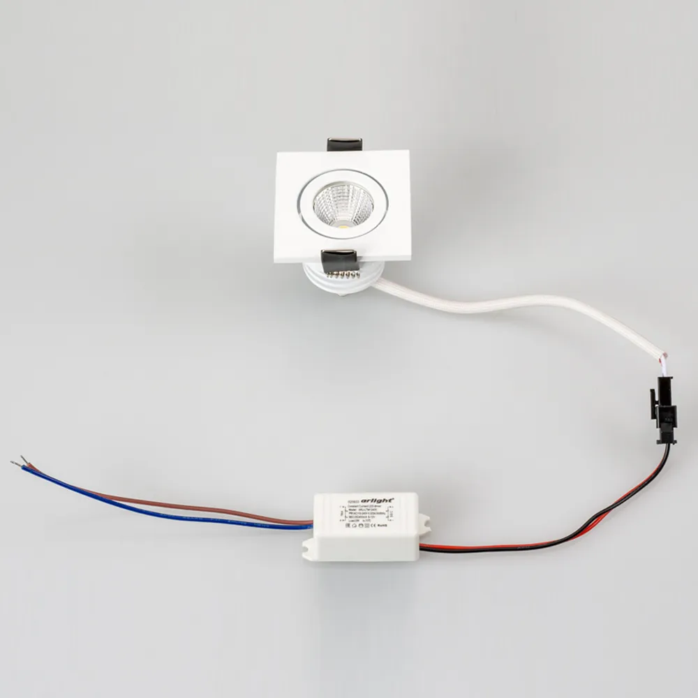 Врезной квадратный мебельный светильник 5Вт, корпус белый алюминий. Цвет ТЕПЛЫЙ БЕЛЫЙ 3000K. Светодиод 1х5W Bridgelux. CRI>80, Св.поток 350-400лм, наклоняемая ось, угол 25°. Питание 180-240VAC, 5Вт, 400mA 11-13V, драйвер в комплекте. Размеры 50x50x50 мм, врезное отверстие d42 мм.