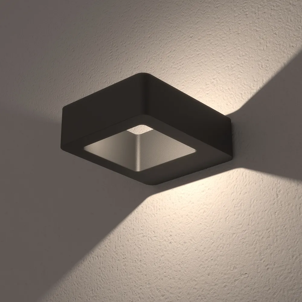 Уличный светодиодный светильник для стен, освещение вверх-вниз. Цвет ТЕПЛЫЙ БЕЛЫЙ 3000К, угол 92°, светодиод 5Вт Bridgelux (160 лм). Влагозащищенный корпус IP54 - темно-серый алюминий, экран ударопрочный PC. Питание 220В, мощность 5 Вт. Размеры ВхШхГ 45х120х145 мм.