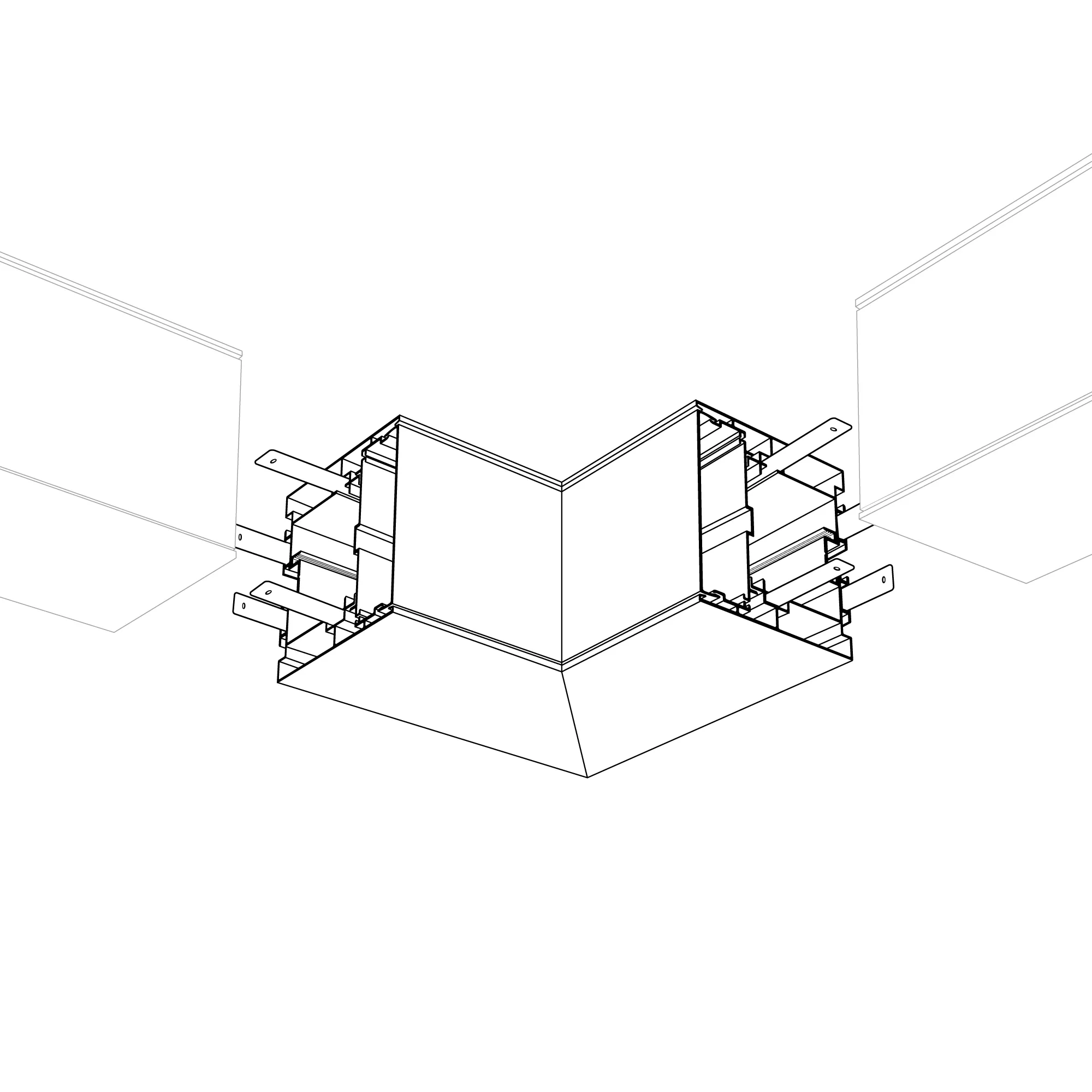 Внутренний угол в сборе, для соединения 2-х профилей S2-LINE-7977 под углом 90°. Экран образует линию внутри угла. В комплекте матовый экран, площадка для ленты, соединители. Длина внешней стороны угла 150 мм.