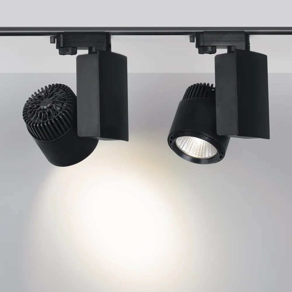 Подвесной светильник для треков/шин 4 провода. Светодиод CREE 40W, цвет БЕЛЫЙ 5000K, св.поток 3200-3600 лм, угол 38°. Чёрный корпус. Мощность 40Вт, питание AC180-240V. Максимальные габариты HxLxW: 205х165х160мм. Встроенный драйвер 27-42V 900mA.