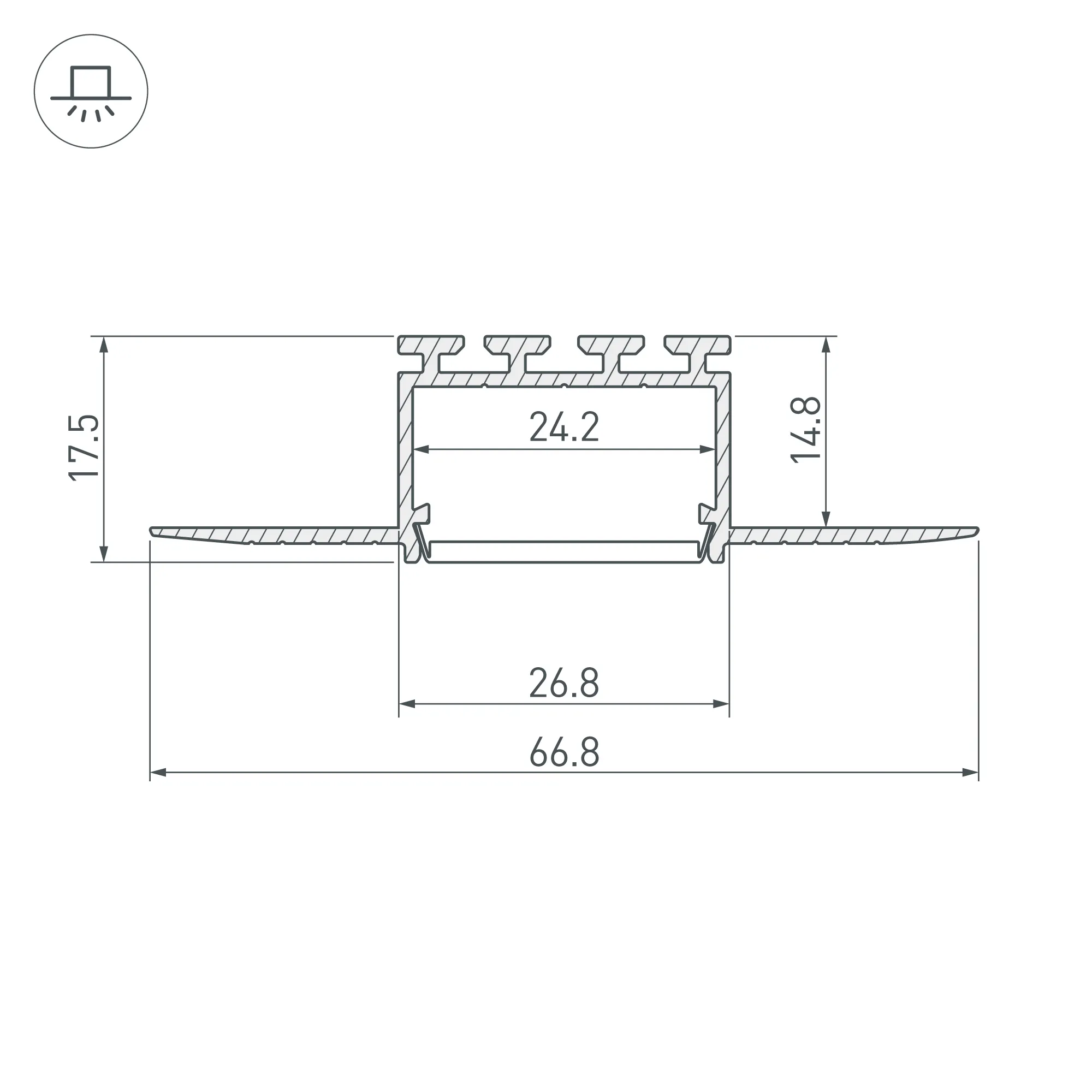 Алюминиевый профиль для светодиодных лент и линеек. Встраиваемый в гипсокартон толщиной 16 мм, под строительную отделку. Позволяет создать линию света шириной 24 мм. без видимых частей алюминия. Габаритные размеры (L×W×H): 2000x67x18 мм. Ширина площадки для ленты 24 мм. Экраны, заглушки и другие аксессуары приобретаются отдельно. Цена за 1 метр.