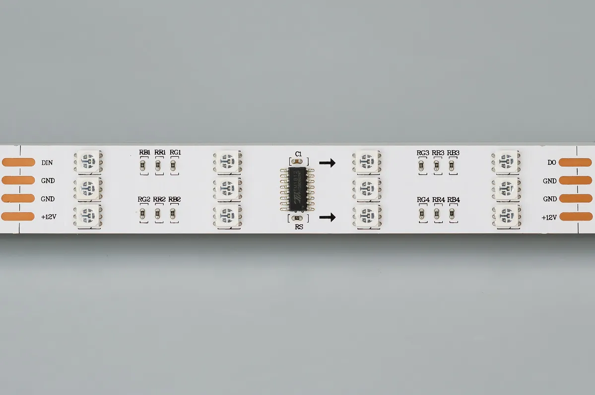 Гибкая открытая трехрядная лента «Бегущие огни» (IP20) с драйвером 1812. Длина 5м, 480шт LED RGB 5060, 32 pixel/m (1 pixel = 3 LED в одном столбце). Питание 12V, ном. мощн.12,8 Вт/м, макс. мощн-ть 16 Вт/м (статический белый цвет). Необходима подводка пит-я с 2 сторон ленты. Ширина 20 мм. Негерметичные ПРЯМОУГОЛЬНЫЕ коннекторы.