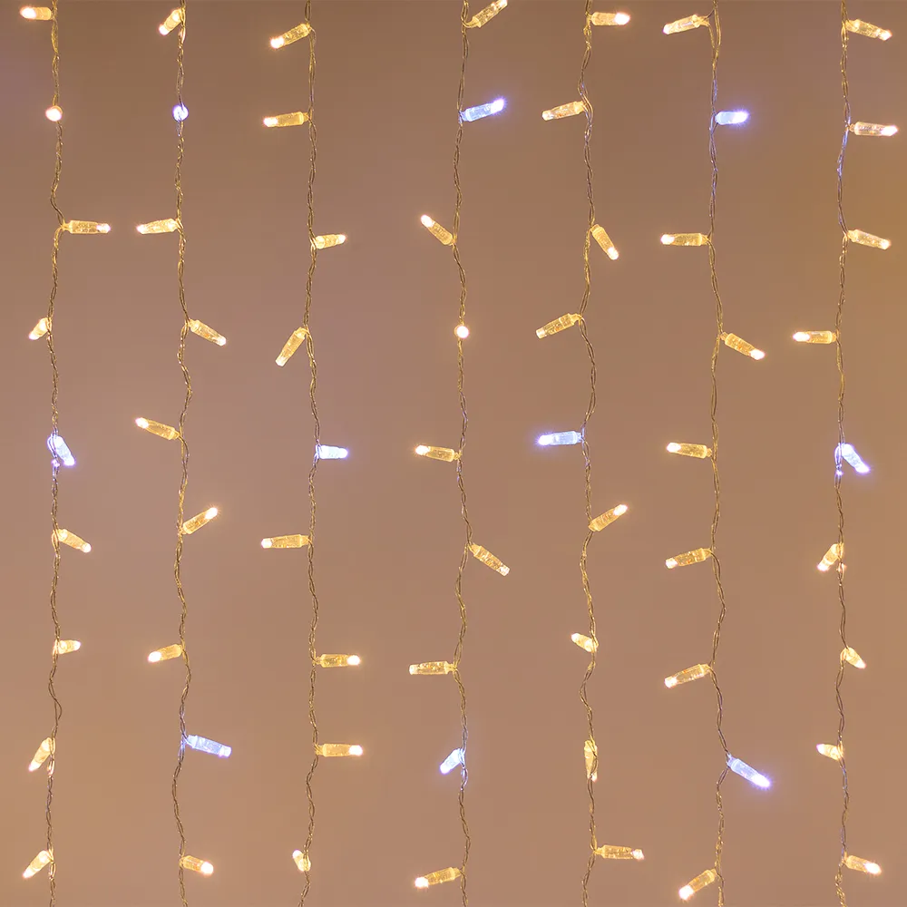 Светодиодный Занавес Classic. Размер 2000x1500 мм (длина 2000 мм, высота 1500 мм). 18 ниспадающих нитей длиной 1500 мм. 360 светодиодов размером 7 мм. Основной цвет свечения ТЕПЛЫЙ БЕЛЫЙ (3000 К), эффект мерцания редких точек БЕЛЫЙ (6000К) с резким световым рисунком (прозрачная вогнутая линза), соотношение светодиодов: 300 теплых постоянного свечения / 60 белых с мерцанием. Эффект частого мерцания. Провод прозрачный, ПВХ. Питание 230 В, Мощность 60 Вт, защита IP65, применение в помещении и на улице под навесом. Аксессуар для подключения и выбора режима свечения в комплекте.