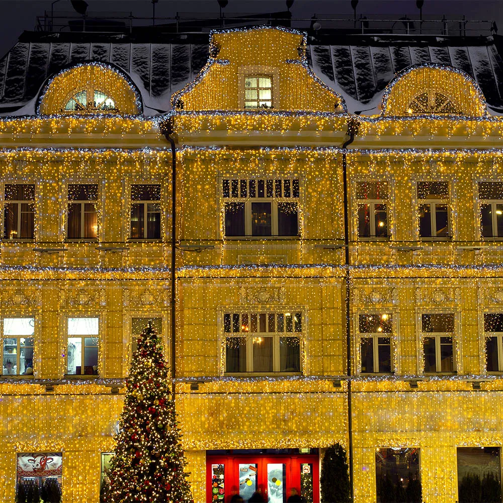 Светодиодный Занавес Classic. Размер 2000x3000 мм (длина 2000 мм, высота 3000 мм). 20 ниспадающих нитей длиной 3000 мм. 760 светодиодов размером 7 мм. Цвет свечения ТЕПЛЫЙ БЕЛЫЙ (3000 К), постоянное свечение и 8 динамических эффектов с резким световым рисунком (прозрачная вогнутая линза). Провод прозрачный, ПВХ. Питание 230 В, Мощность 60 Вт, защита IP65, применение в помещении и на улице под навесом. Аксессуар для подключения и выбора режима свечения в комплекте.