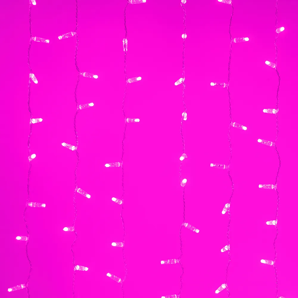 Светодиодный Занавес Classic. Размер 2000x3000 мм (длина 2000 мм, высота 3000 мм). 20 ниспадающих нитей длиной 3000 мм. 760 светодиодов размером 7 мм. Цвет свечения РОЗОВЫЙ, постоянное свечение и 8 динамических эффектов с резким световым рисунком (прозрачная вогнутая линза). Провод прозрачный, ПВХ. Питание 230 В, Мощность 60 Вт, защита IP65, применение в помещении и на улице под навесом. Аксессуар для подключения и выбора режима свечения в комплекте.
