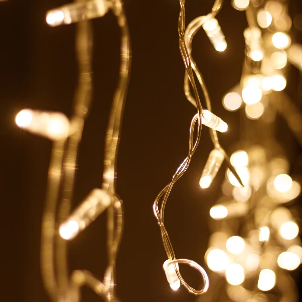 Светодиодная бахрома Classic. Размер 2400x600 мм (длина 2400 мм, по длине 24 нити высотой 200/600 мм). Количество светодиодов 88 шт размером 7 мм. Цвет свечения ТЕПЛЫЙ БЕЛЫЙ (3000 К), эффект постоянного свечения с резким световым рисунком (прозрачная вогнутая линза). Провод прозрачный, ПВХ. Питание 230 В, Мощность 6 Вт, защита IP65, применение на улице под навесом. Аксессуары для подключения приобретаются отдельно.