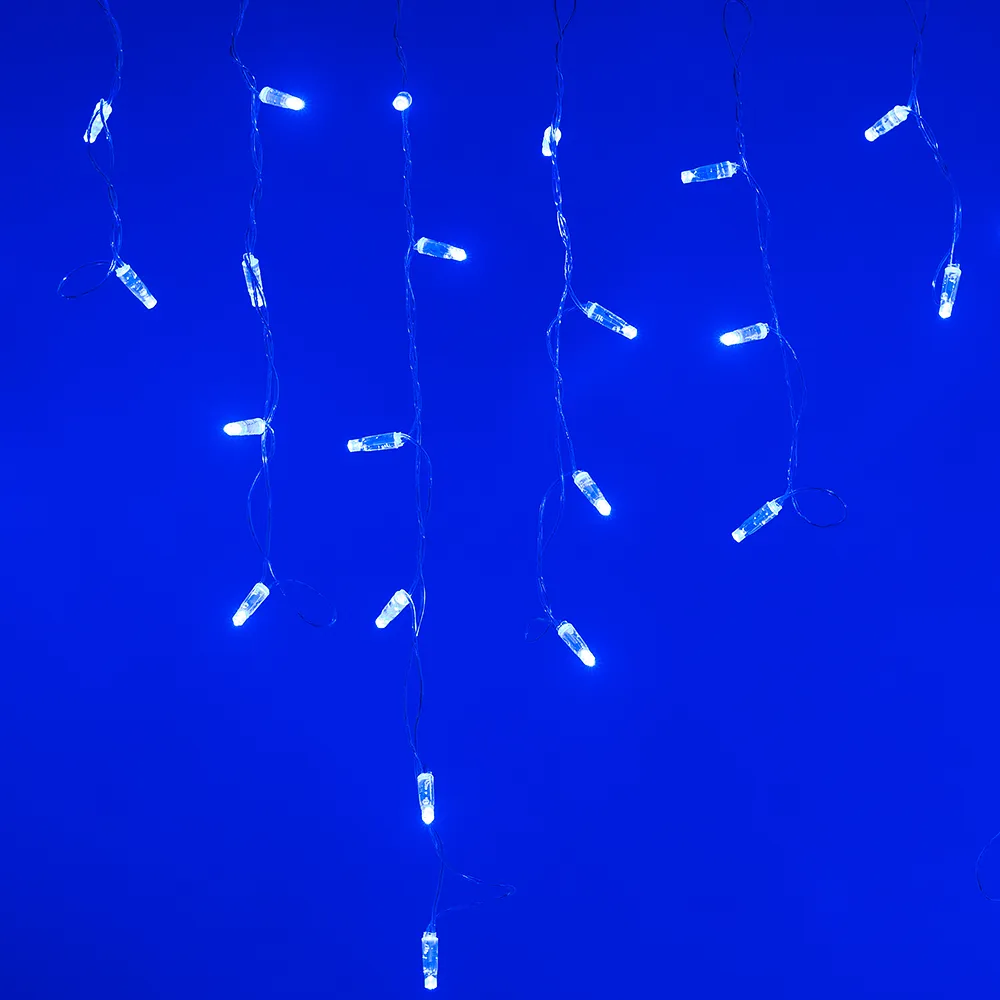 Светодиодная бахрома Classic. Размер 2400 мм (длина 2400 мм, по длине 24 нити высотой 200/600 мм). Количество светодиодов 88 шт размером 7 мм. Основной цвет свечения СИНИЙ, эффект мерцания редких точек (БЕЛЫЙ 6000К) с резким световым рисунком (прозрачная вогнутая линза), соотношение светодиодов: 22 синих постоянного свечения / 12 белых с мерцанием. Эффект частого мерцания. Провод прозрачный, ПВХ. Питание 230 В, Мощность 6 Вт, защита IP65, применение на улице под навесом. Аксессуары для подключения приобретаются отдельно.