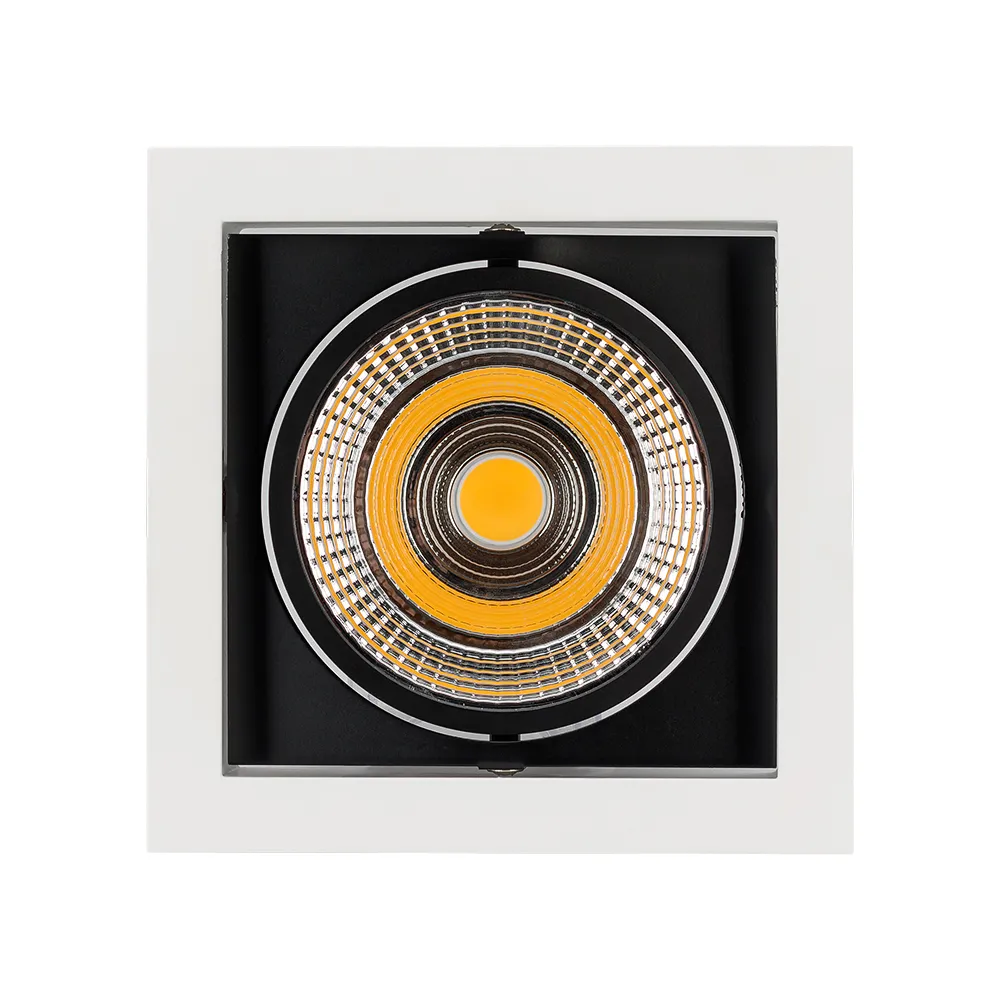 Поставка под заказ от 100 штук. Встраиваемый карданный светильник. Угол 30° / 25Вт / ДНЕВНОЙ 4000K / 2200лм, CRI>90. Корпус из белого алюминия с черными вставками. Питание AC220-240V, 25Вт, 700mA 30-42V, драйвер в комплекте. Размеры LxWxH: 152х152x95мм, отверстие для установки 140x140мм.