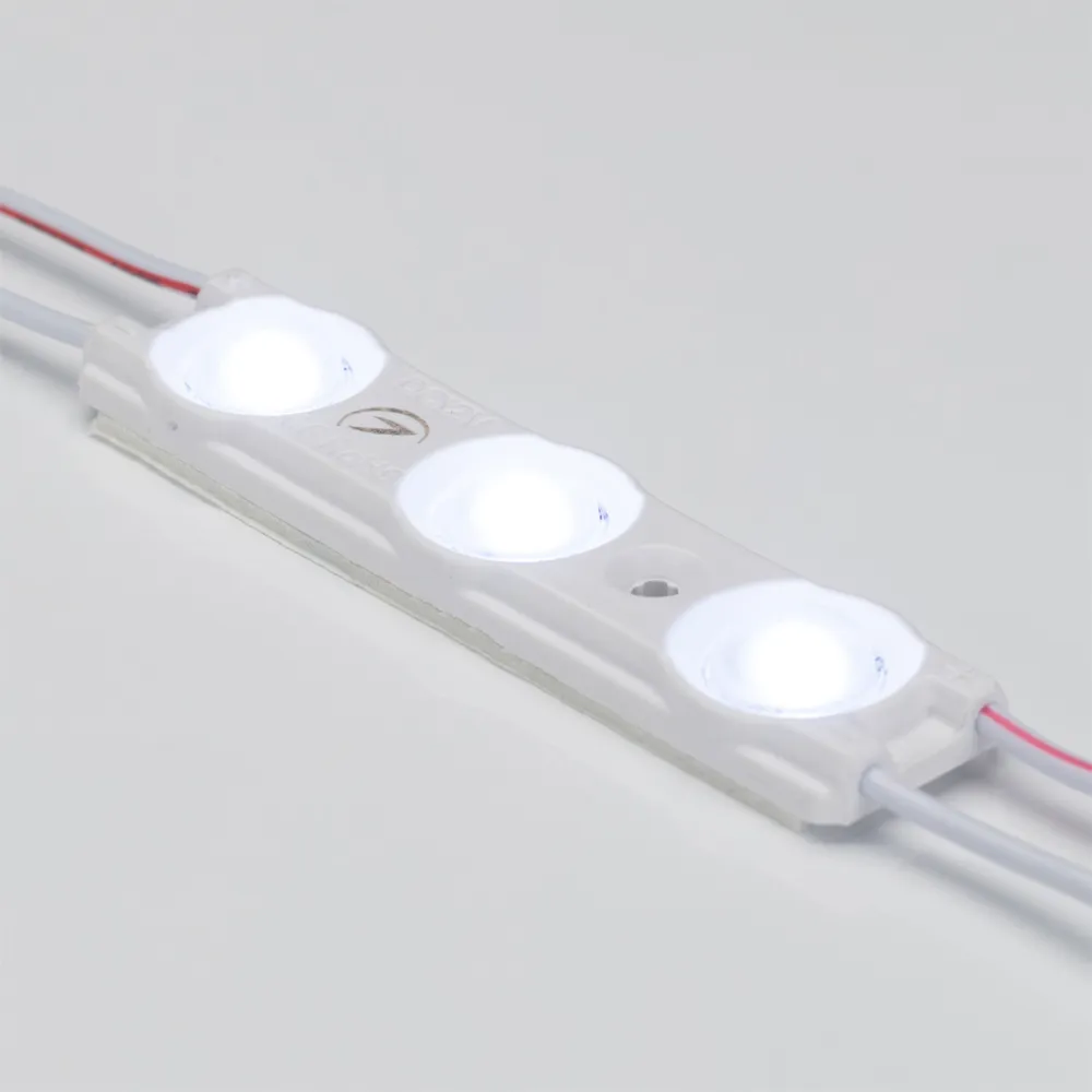 Герметичный светодиодный модуль IP67, ХОЛОДНЫЙ 8000–10000 К, напряжение 12 В, мощность 1.5 Вт, св. поток 135 лм, 3 светодиода SMD 2835, угол 160°. 30 шт на проводе, расстояние между центрами модулей 210 мм, длина провода между модулями 130 мм, рекомендуемая глубина установки 100–200 мм. Размер 70х16x5.7 мм. Гарантия 5 лет.
