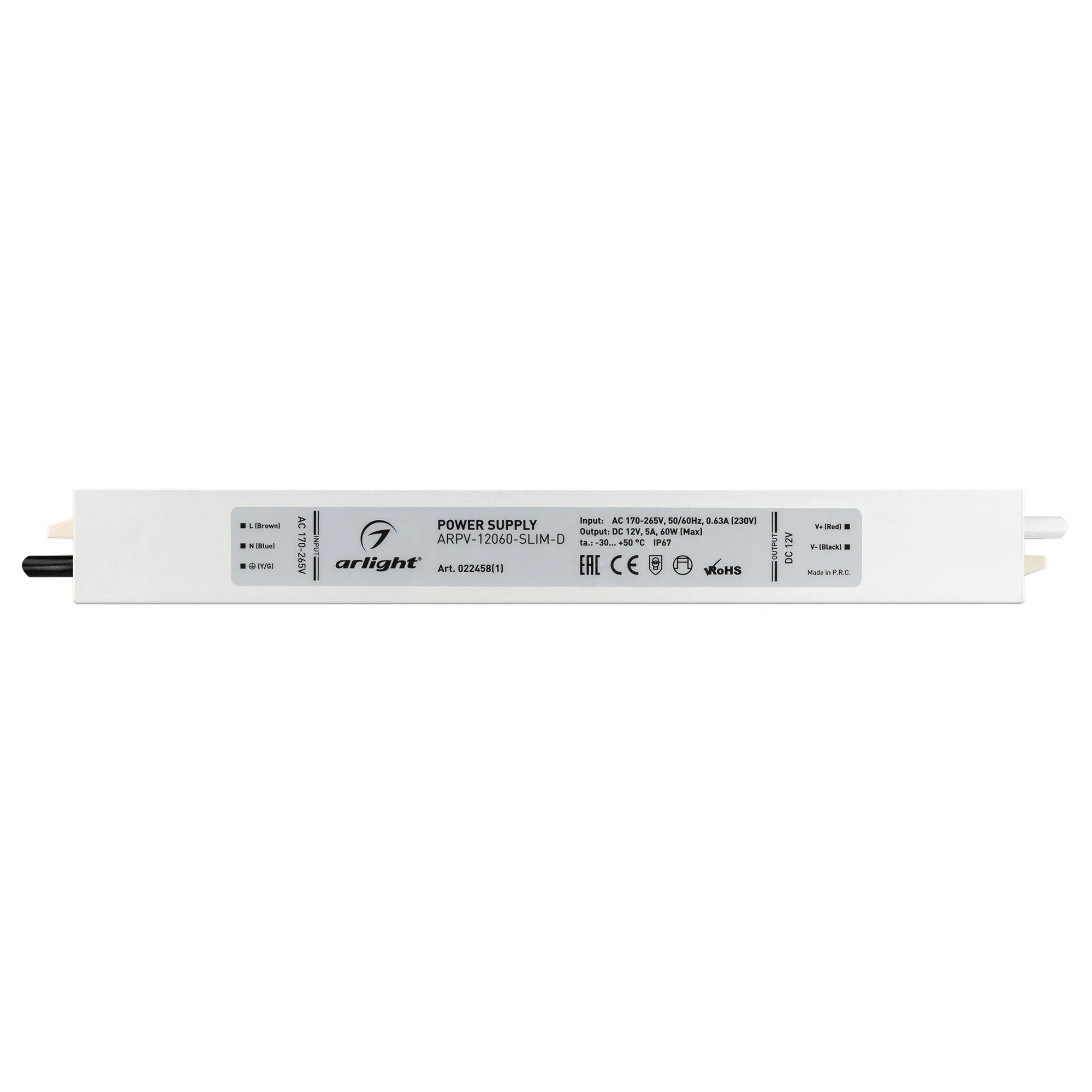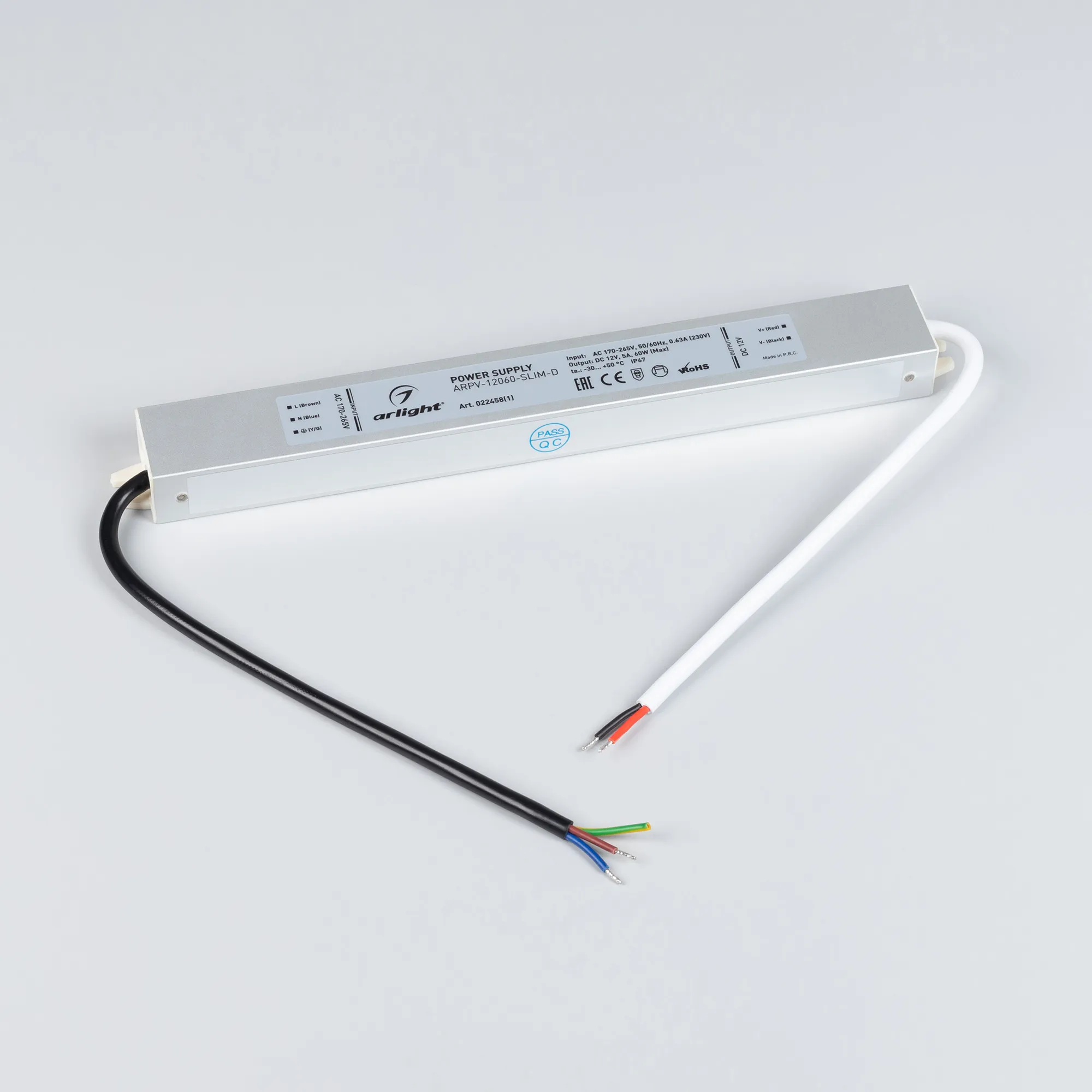 Источник напряжения с гальванической развязкой для светодиодных изделий. Входное напряжение 170-265 VAC. Выходные параметры: 12 В, 5 А, 60 Вт. Герметичный алюминиевый корпус IP 67. Рабочая температура -30…+50C⁰. Габаритные размеры длина 257 мм, ширина 30 мм, высота 20 мм. Гарантийный срок 3 года.