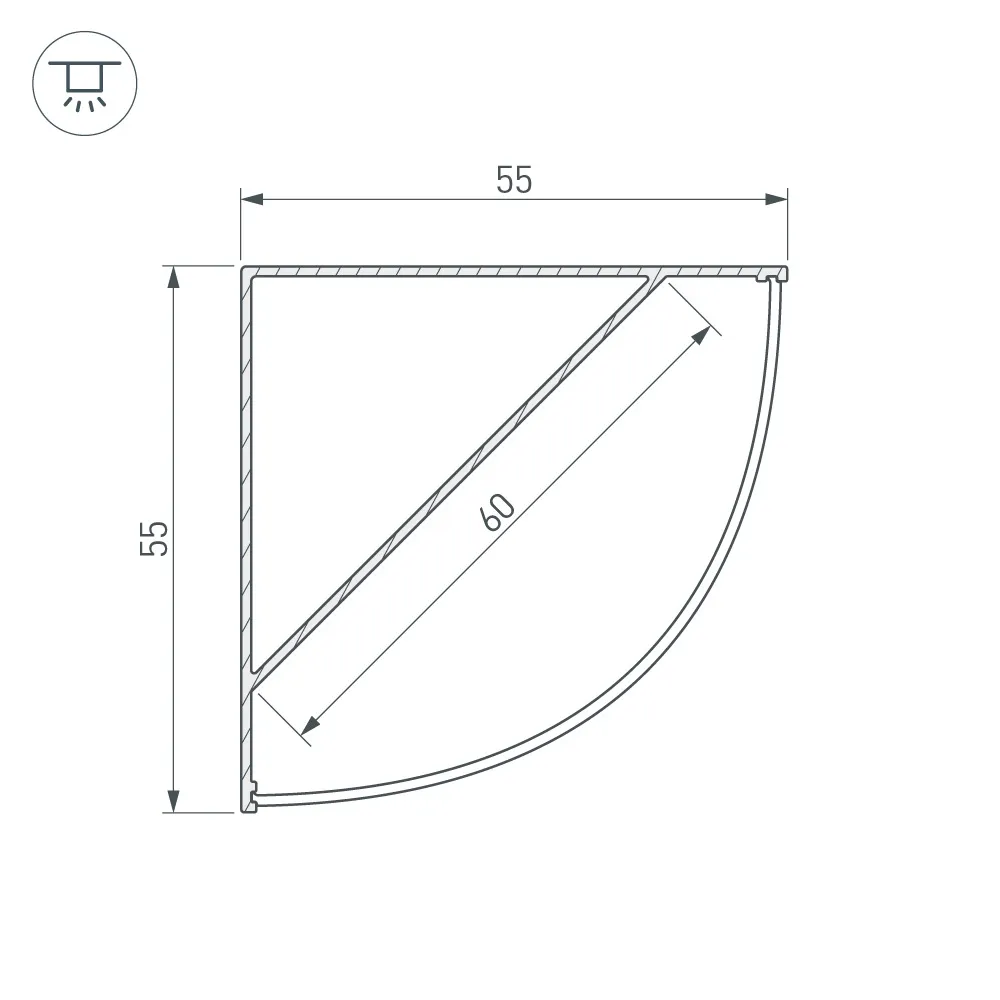 Алюминиевый анодированный угловой профиль для светодиодных лент и линеек. Габаритные размеры (L×W×H): 2000x55x55 мм. Ширина площадки для ленты 60 мм. Экраны, заглушки и другие аксессуары приобретаются отдельно. Цена за 1 метр.