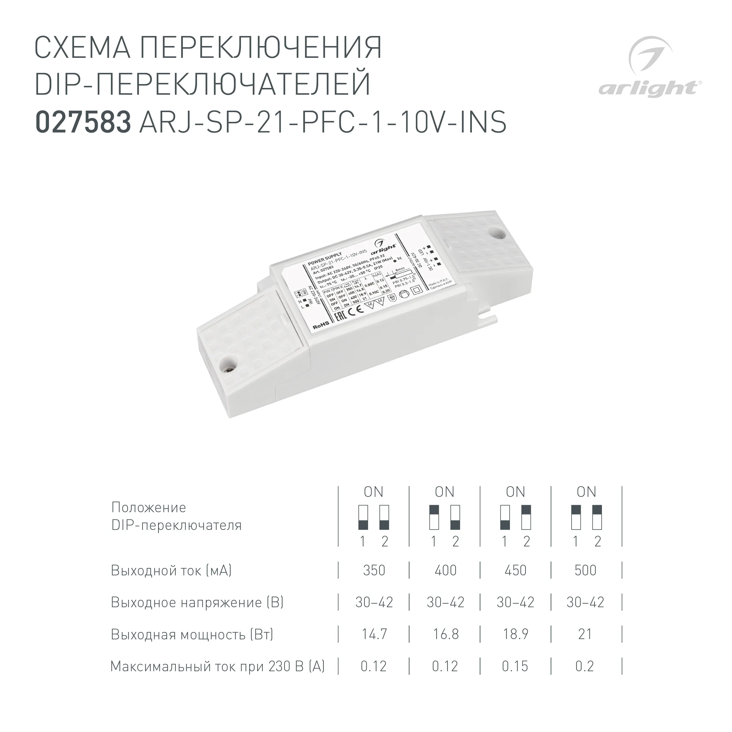 В магазине Арлед Маркет Вы можете купить "Блок питания ARJ-SP-21-PFC-1-10V-INS (21W, 350-500mA) (Arlight, IP20 Пластик, 5 лет)"