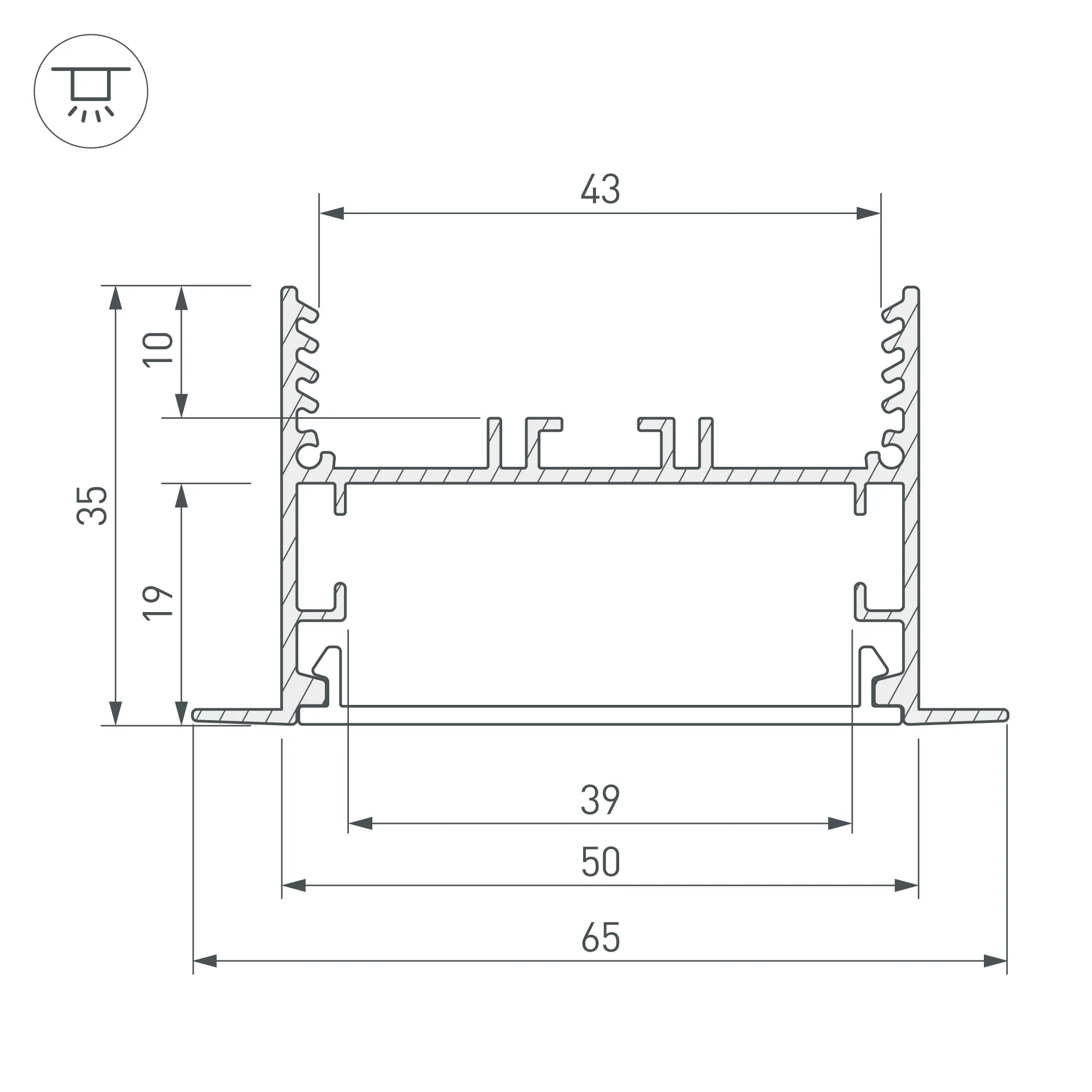 Алюминиевый анодированный профиль для светодиодных лент и линеек. Габаритные размеры (L×W×H): 2000x65x35 мм. Ширина площадки для ленты 38 мм, паз для установки 50 мм. Экраны, заглушки и другие аксессуары приобретаются отдельно. Цена за 1 метр.