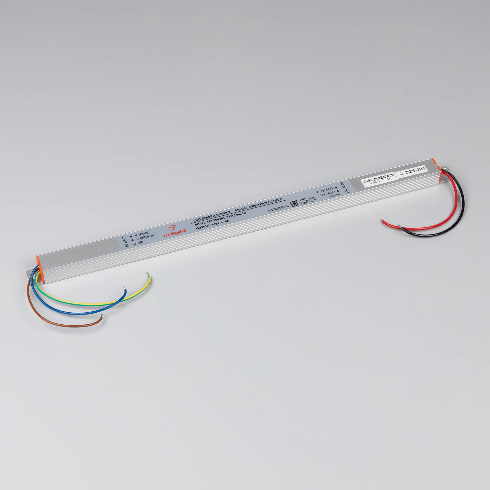 Источник напряжения с гальванической развязкой для светодиодных изделий. Входное напряжение 200-240 VAC. Выходные параметры: 12 В, 5 А, 60 Вт. Встроенный PFC >0,5. Негерметичный алюминиевый корпус IP 20. Габаритные размеры длина 365 мм, ширина 18 мм, высота 15 мм. Гарантийный срок 2 года.