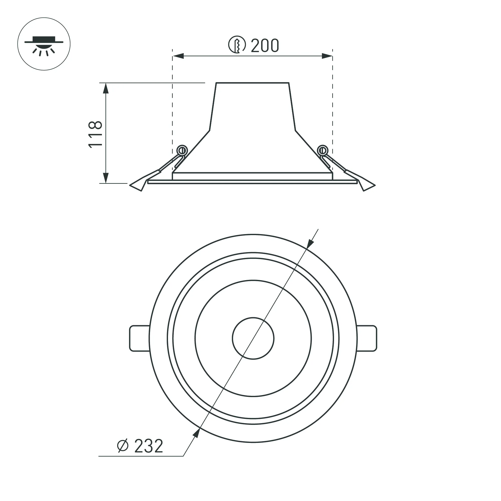 Встраиваемый светильник "Даунлайт" 35Вт. Цвет свечения ТЕПЛЫЙ 3000К. Световой поток 2870лм, угол 50°, CRI>80. Белый корпус. Питание AC220-240V. Габариты: Ø232х118мм, врезное отверстие Ø195-210мм. Драйвер в комплекте (26.5-44.5V, 900mA).