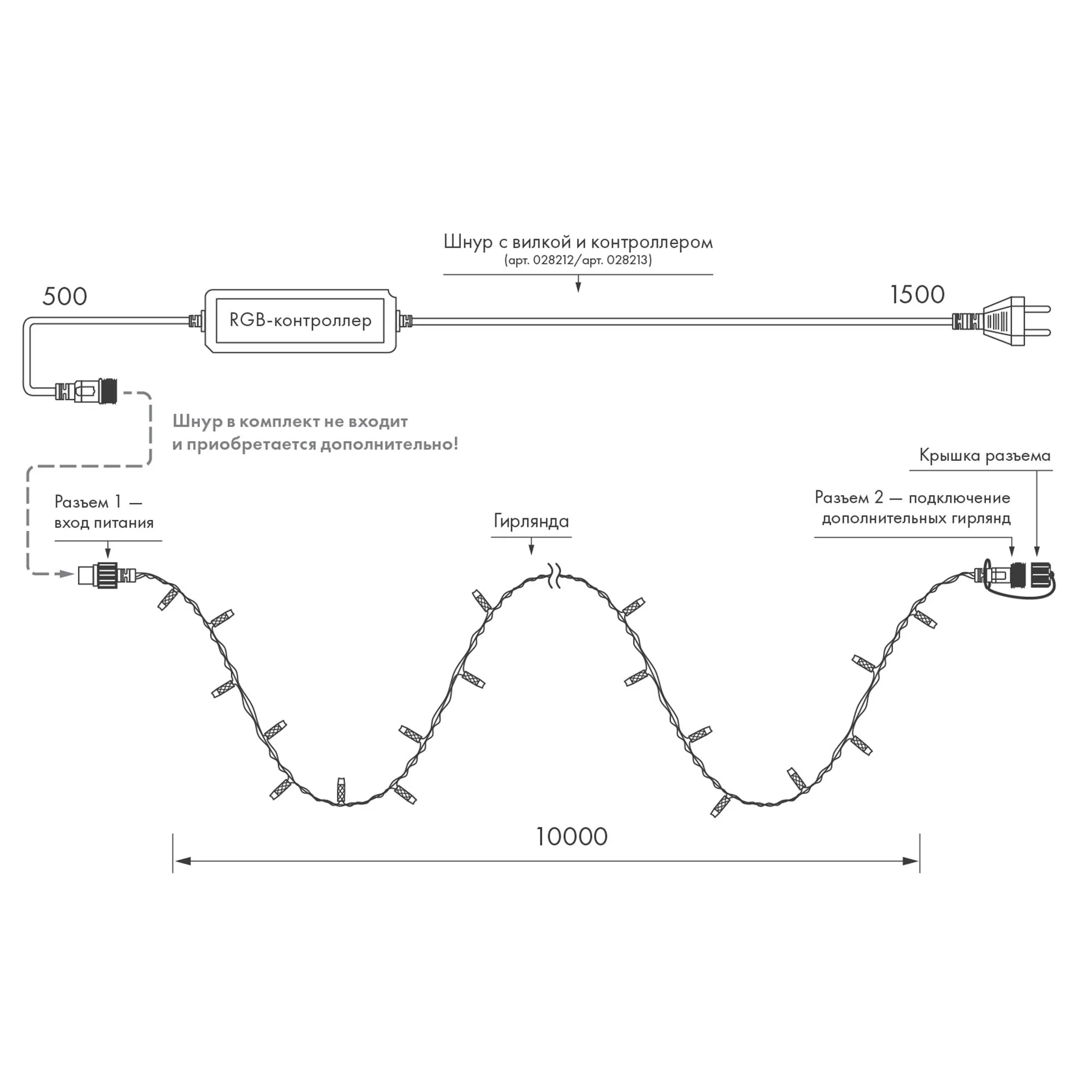 Светодиодная нить Classic. Размер 10000 мм. Цвет свечения RGBW, 95 светодиодов размером 7 мм с динамическими и статическими эффектами свечения с резким световым рисунком (прозрачная вогнутая линза), управление по протоколу DMX512. Смена эффектов и управление осуществляется с помощью контроллера с пультом. Провод черный, ПВХ. Питание 24 В, Мощность 10 Вт, защита IP65, применение в помещении и на улице под навесом. Аксессуары для подключения и управления приобретаются отдельно. Для эксплуатации и выбора динамического режима необходимо приобрести контроллер и DMX512 декодер (см. совместимые). Актуальная схема подключения в паспорте изделия.