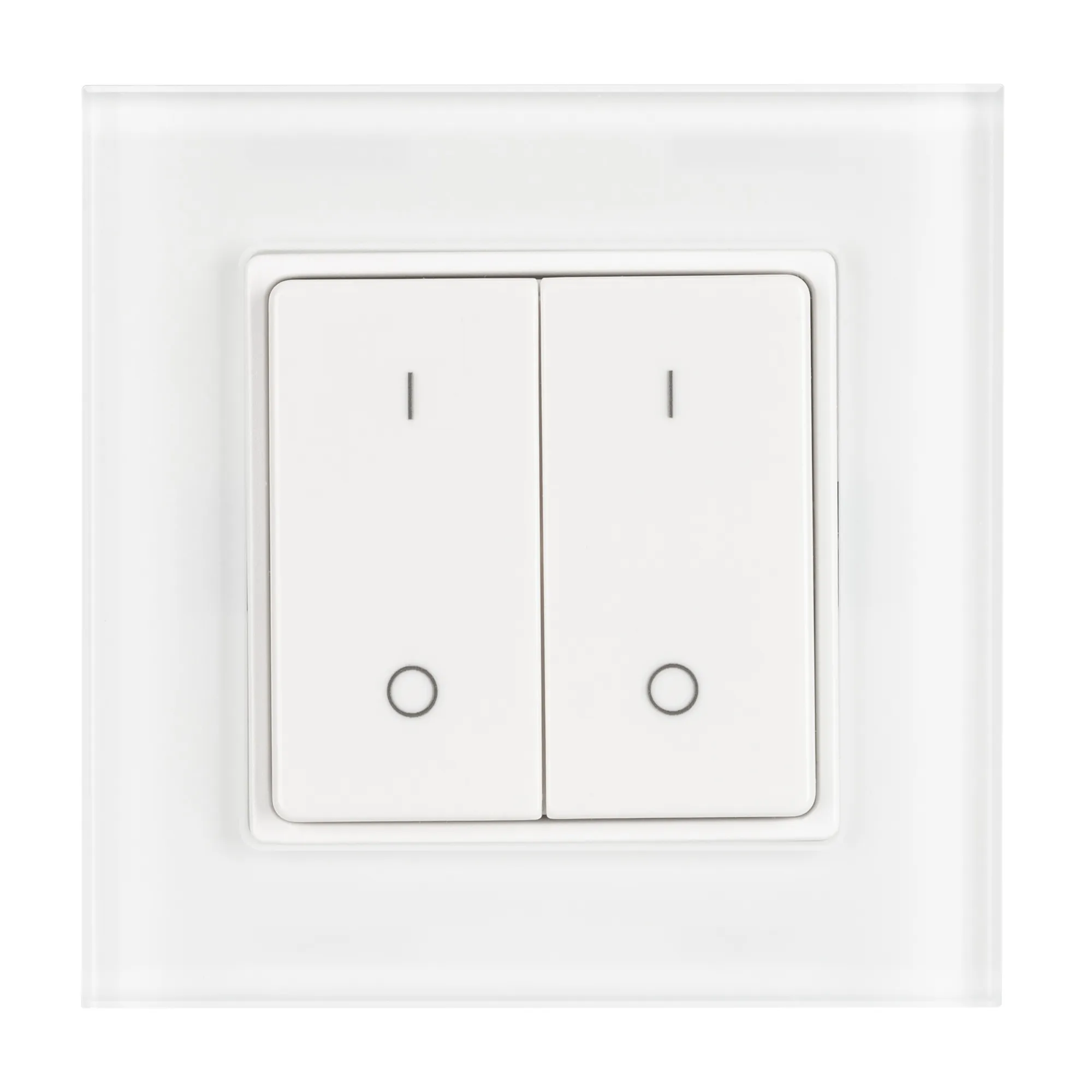 Накладная кнопочная панель 2.4 ГГц, цвет белый. Материал - стекло. Для управления одноцветными источниками света, 2 зоны управления. Питание/рабочее напряжение 3VDC от батарейки CR2032. Габариты 86х86х15 мм. Совместима с диммерами SMART.