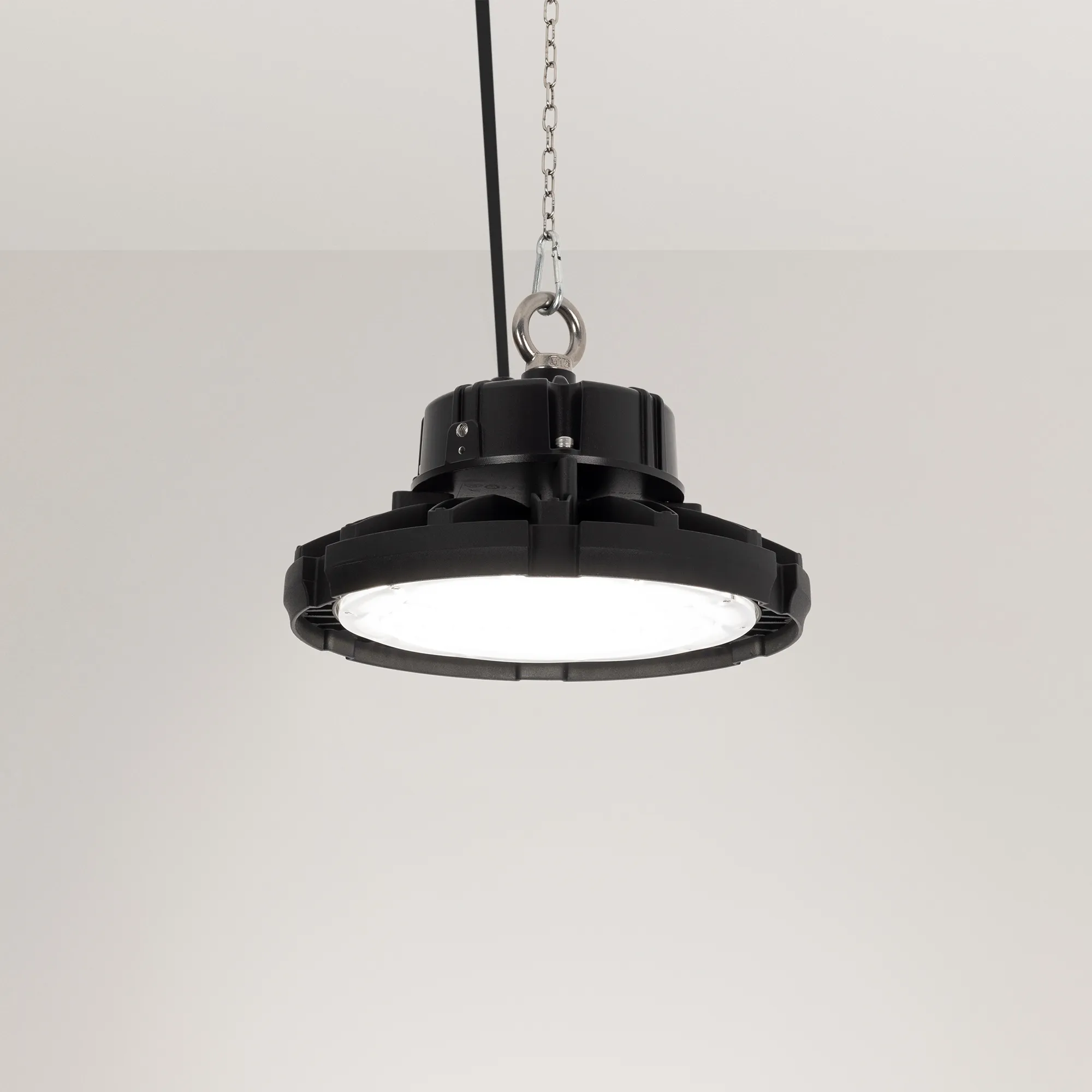 Поставка под заказ от 250 шт. Светильник для освещения складских и промышленных помещений. Мощность 200W, напряжение питания AC 220-240V/50Hz. CRI 80. Тип светодиодов SMD2835, с групповой оптической линзой. Цвет свечения ДНЕВНОЙ 5000K, световой поток 28000 Lm, угол рассеивания 120°. Цвет корпуса черный, линза из поликарбоната, степень влагозащиты IP65. Габариты Ф320xH197мм.
