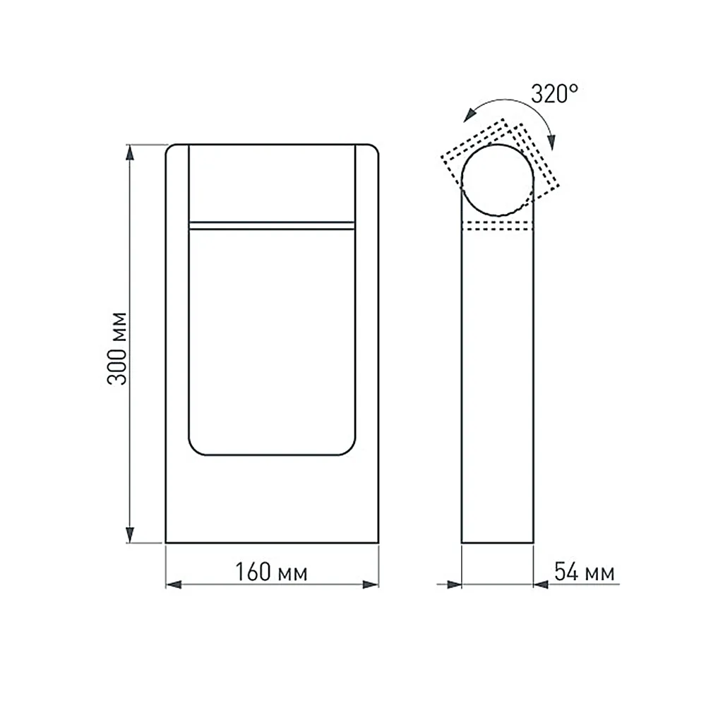 300мм уличный светодиодный светильник для дорожек, изменяемый угол освещения (111 градусов), на 2 стороны. Цвет ТЕПЛЫЙ БЕЛЫЙ 3000К, светодиоды 6Вт SMD (275 лм). Влагозащищенный корпус IP65 - темно-серый алюминий, экран ударопрочный PC. Питание 230В, мощность 6 Вт. Размеры ВхШхГ 300х160х54 мм.