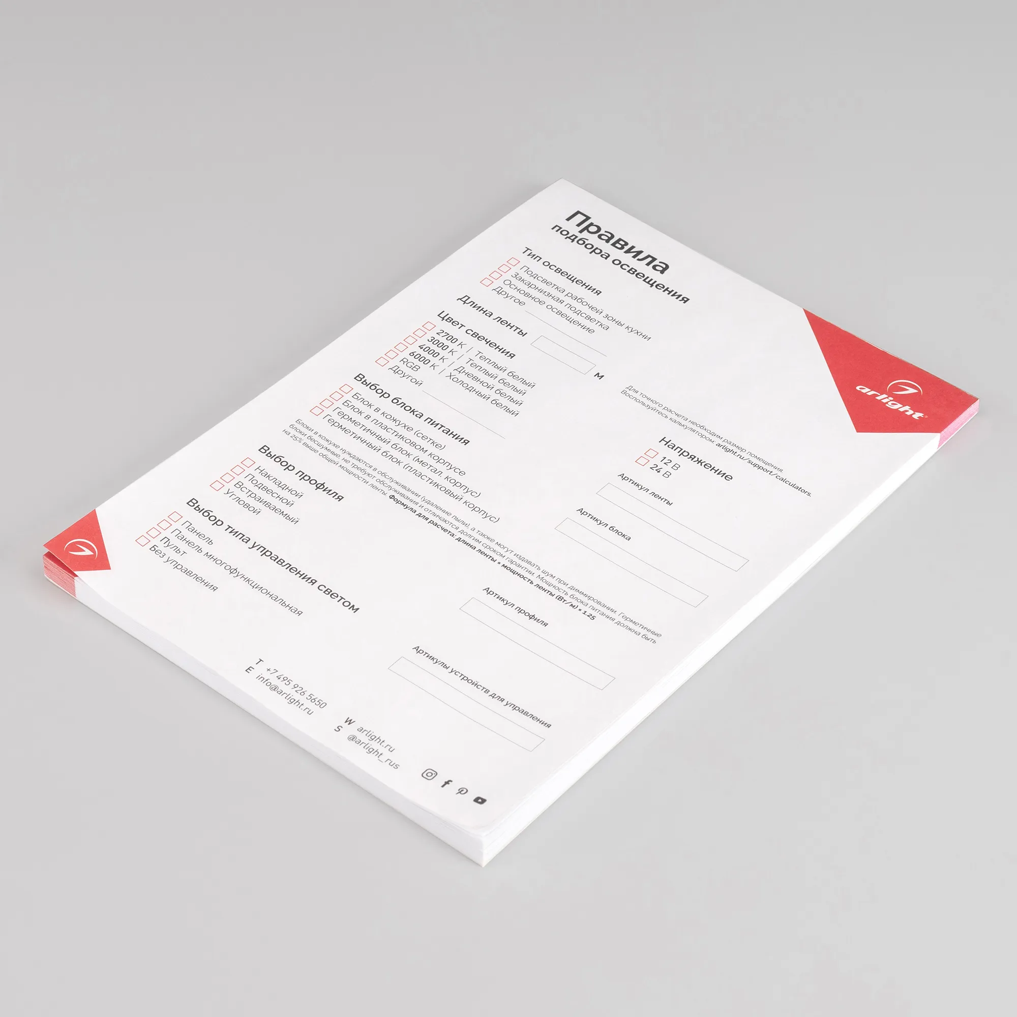 В магазине Арлед Маркет Вы можете купить "Блокнот- подсказка Правила подбора ленты, блоков питания, профиля и управления (Arlight, -)"