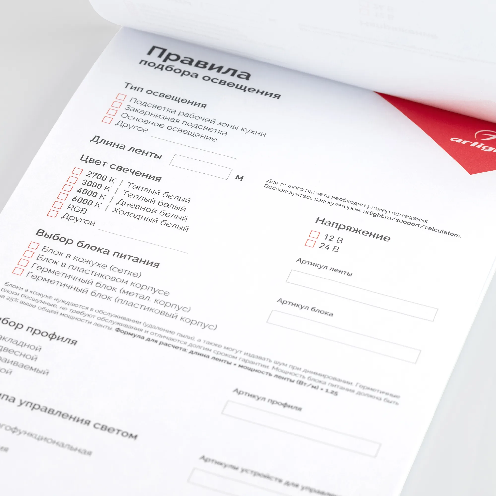 Блокнот- подсказка Правила подбора ленты, блоков питания, профиля и управления (Arlight, -)