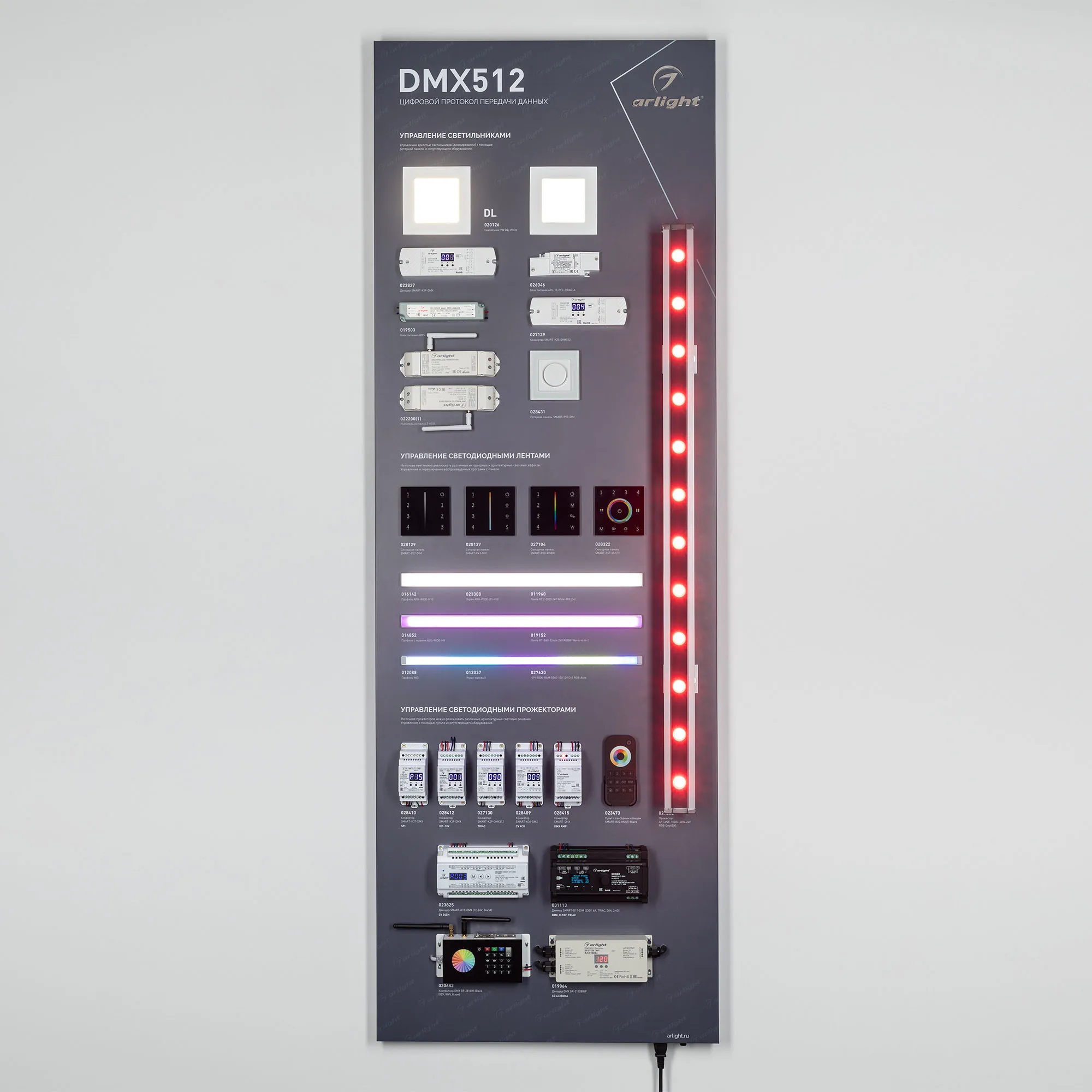 В магазине Арлед Маркет Вы можете купить "Стенд Управление светильниками DMX512 E34 1760x600mm (DB 3мм, пленка, лого) (Arlight, -)"