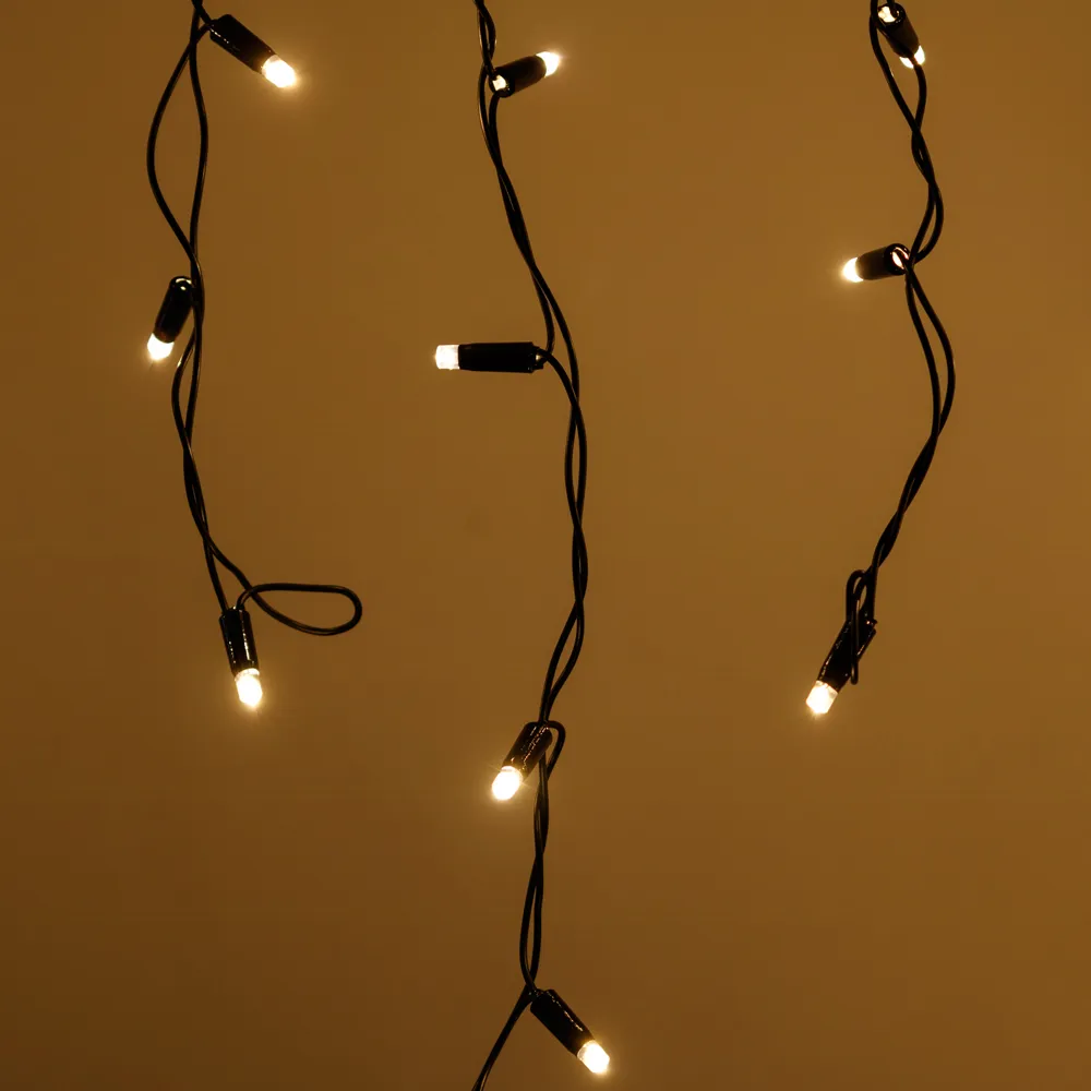 Светодиодная бахрома Classic. Размер 2400x600 мм (длина 2400 мм, по длине 24 нити высотой 200/600 мм). Количество светодиодов 88 шт размером 7 мм. Цвет свечения ТЕПЛЫЙ БЕЛЫЙ (3000 К), эффект постоянного свечения с мягким световым рисунком (выпуклая молочно-белая линза). Провод черный, ПВХ. Питание 230 В, Мощность 6 Вт, защита IP65, применение на улице под навесом. Аксессуары для подключения приобретаются отдельно.