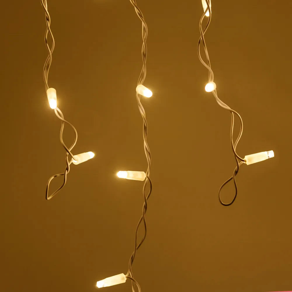 Светодиодная бахрома Pro. Размер 4000x600 мм (длина 4000 мм, по длине 32 нити высотой 200/600 мм). Количество светодиодов 128 шт размером 7 мм. Цвет свечения ТЕПЛЫЙ БЕЛЫЙ (3000 К), эффект постоянного свечения с мягким световым рисунком (выпуклая молочно-белая линза). Провод белый, резиновый. Питание 230 В, Мощность 8 Вт, защита IP65, применение на улице под навесом. Аксессуары для подключения приобретаются отдельно.