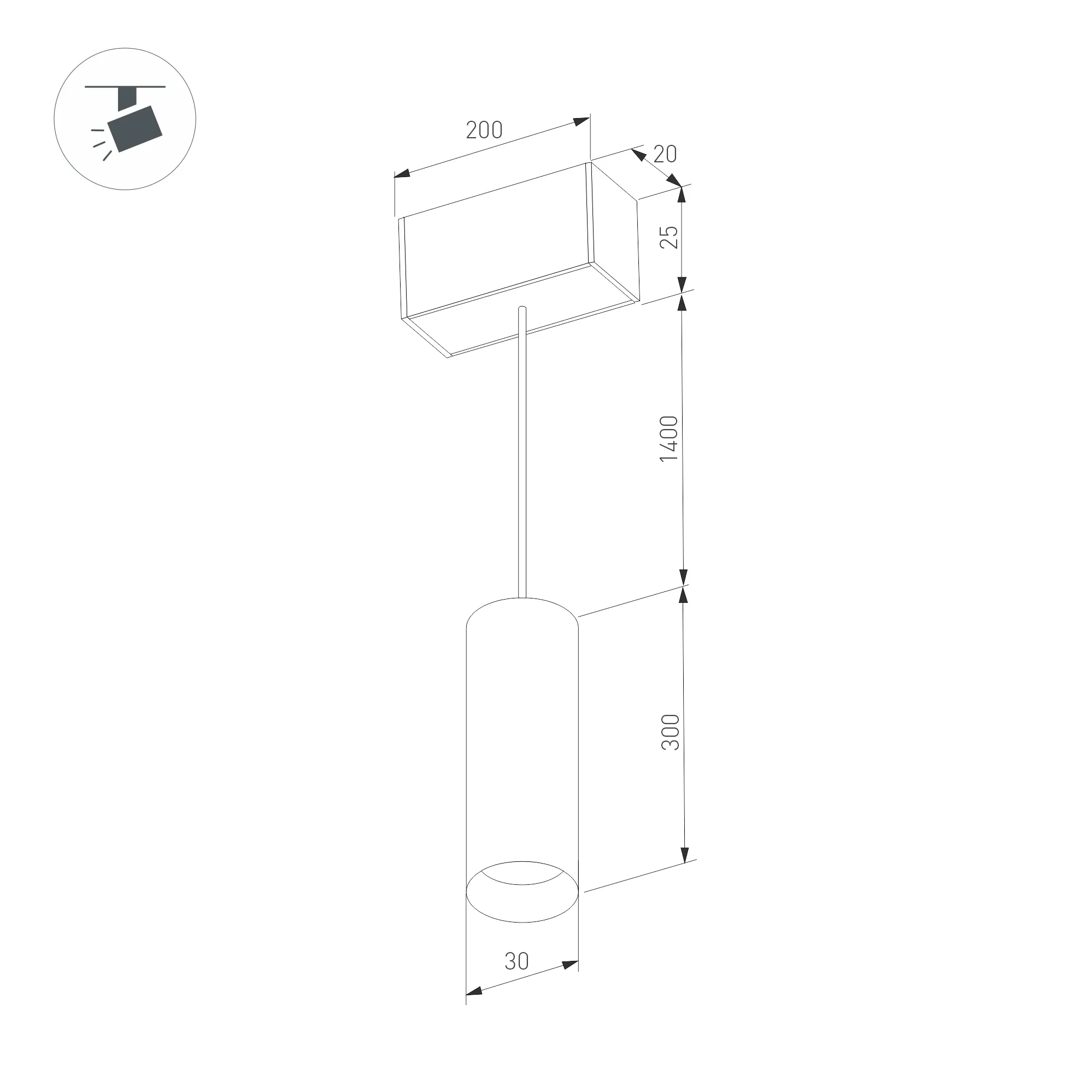 Светильник подвесной для магнитных треков шириной 25мм, 5Вт. Цвет свечения ДНЕВНОЙ 4000K, световой поток 300лм, угол 45°, CRI>90. Корпус цилиндрический, металл, цвет черный с золотой вставкой, IP20. Размер светового модуля 30*300 мм; размер установочного модуля 200*20*25мм; длина подвеса 1400 мм. Входное напряжение DC24V, мощность 5Вт. Драйвер DС24V/AC230V поставляется отдельно. Диммируется только с 026407, 027633. Подвес регулируется.