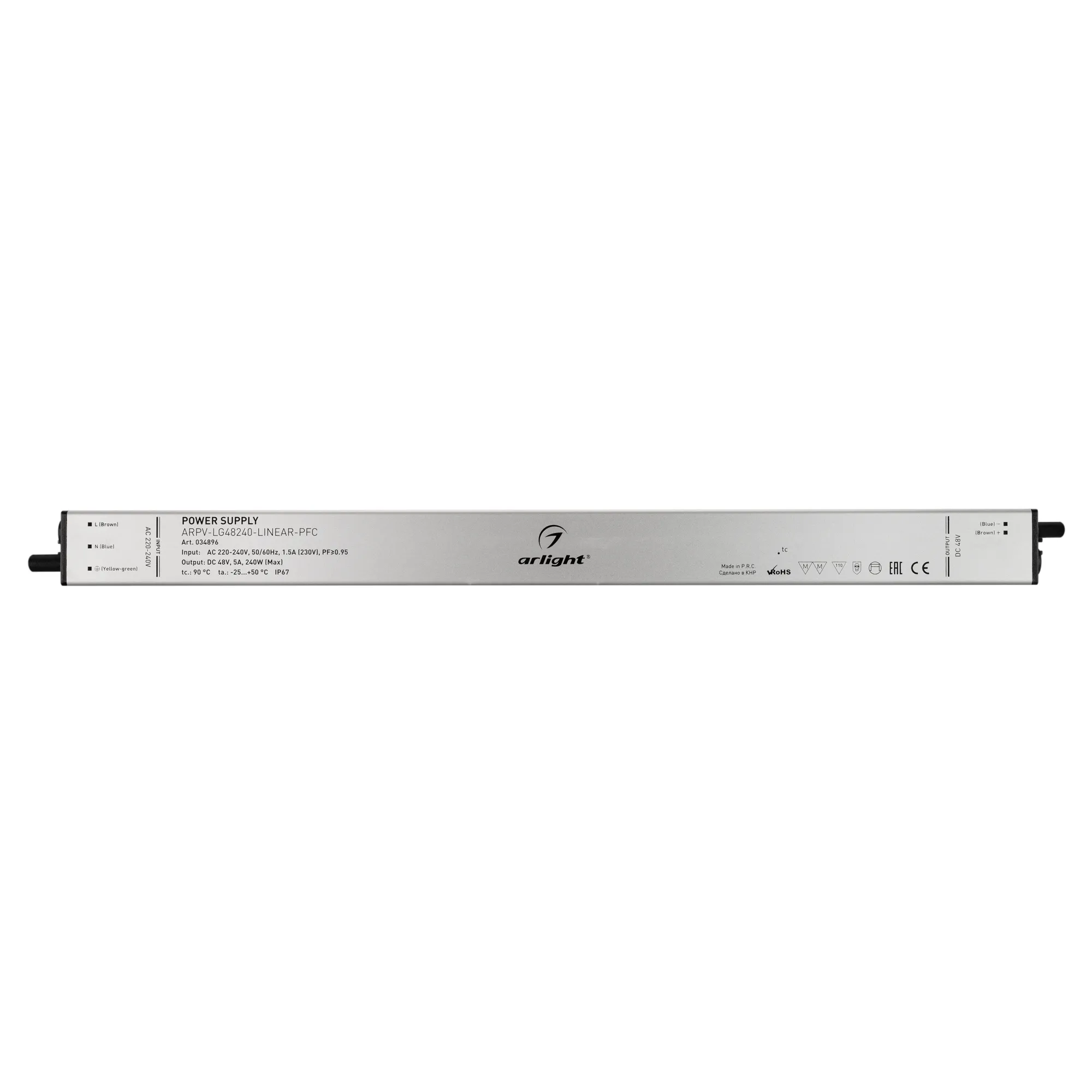 Источник напряжения с гальванической развязкой для светодиодных изделий. Входное напряжение 220-240 VAC. Выходные параметры: 48 В, 5 А, 240 Вт. Встроенный PFC >0.95. Тонкий металлический корпус IP67. Вход: 220-240VAC. Выход: 48VDC. Размер 400х30х21 mm.. Совместимость со стандартом EMC. Гарантия 5 лет. Допускается использование только внутри помещений.