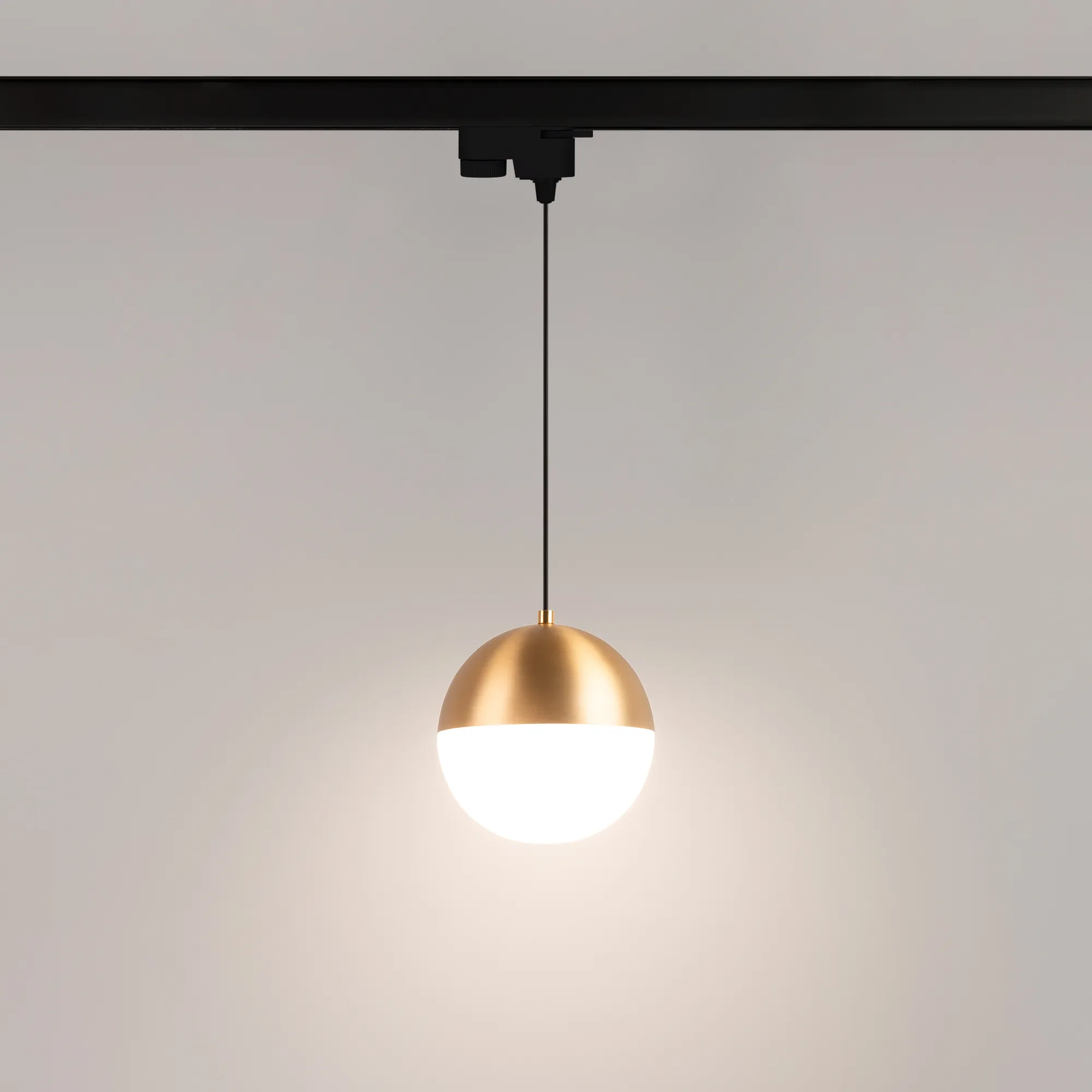 Светильник подвесной для треков/шин 2 провода. Мощность 11 Вт, св. поток 960 лм, 80 лм/Вт, дневной 4000 K, CRI>90, угол 170°, напряжение питания 230 В. Золотой корпус из алюминия, материал плафона стекло, степень защиты IP20. Размер: диаметр 150 мм, длина подвеса 1500 мм. Монтаж на трек 1-фазный. Драйвер 28-42 В, 250 мА, пульсация <1%.