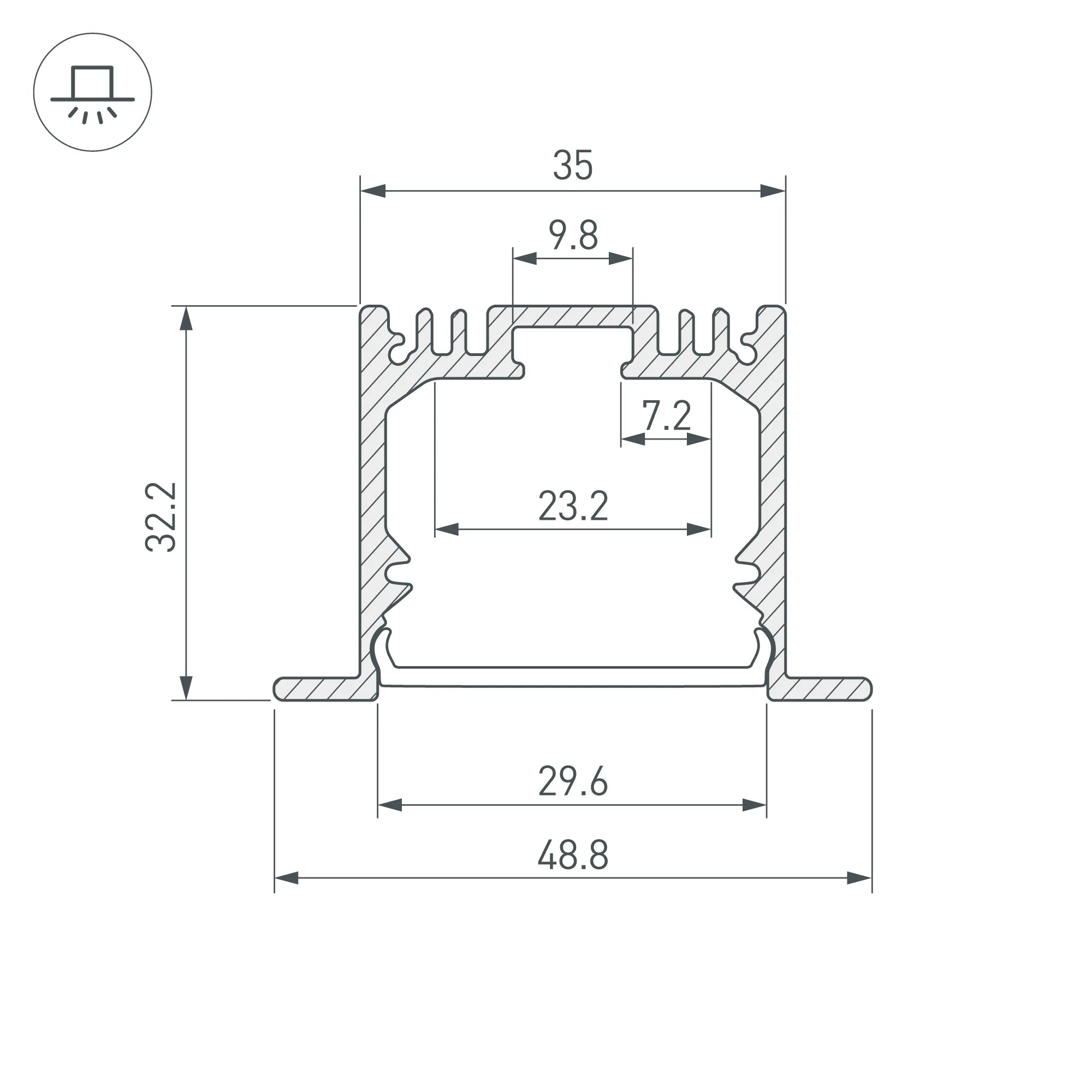 Алюминиевый анодированный профиль для светодиодных лент и линеек. Габаритные размеры (L×W×H): 3000x49x32 мм, паз для установки 35 мм. Ширина площадки для ленты 23 мм. Экраны, заглушки и другие аксессуары приобретаются отдельно. Цена за 1 метр.