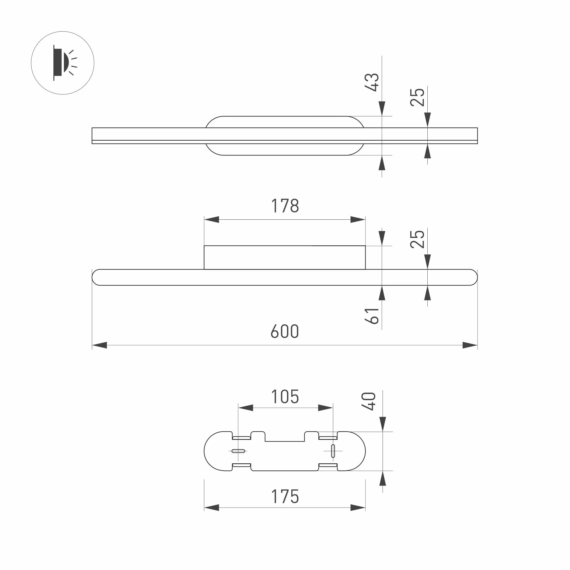 Декоративный настенный светильник. Мощность13 Вт, св. поток 630 лм, 52 лм/Вт, дневной 4000 K, CRI>90, угол 120°, напряжение питания 230 В. Черный фигурный корпус из алюминия, экран из матового поликарбоната, степень защиты IP54. Размер: длина 600 мм, ширина 55 мм, высота 65 мм. Размер светоизлучающего модуля: длина 600 мм, ширина 25 мм, высота 25 мм Монтаж накладной. Пульсация <0,5.