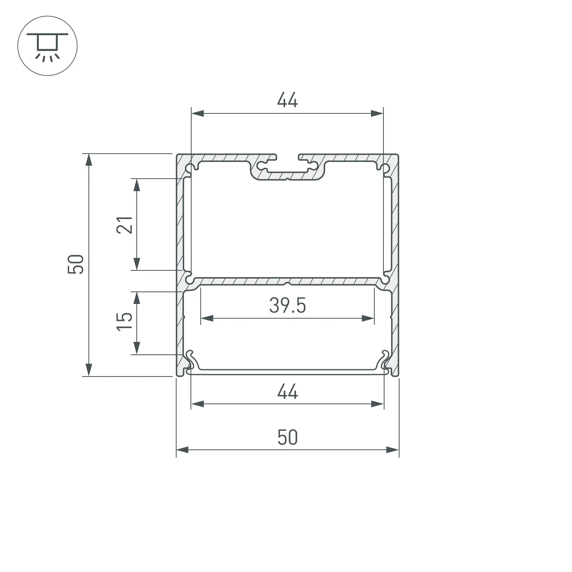 Алюминиевый анодированный профиль для светодиодных лент и линеек. Габаритные размеры (L×W×H): 2000x50x50 мм. Ширина площадки для ленты 39,5 мм. Отсек для БП 44х21 мм. Экраны, заглушки и другие аксессуары приобретаются отдельно. Цена за 1 метр.