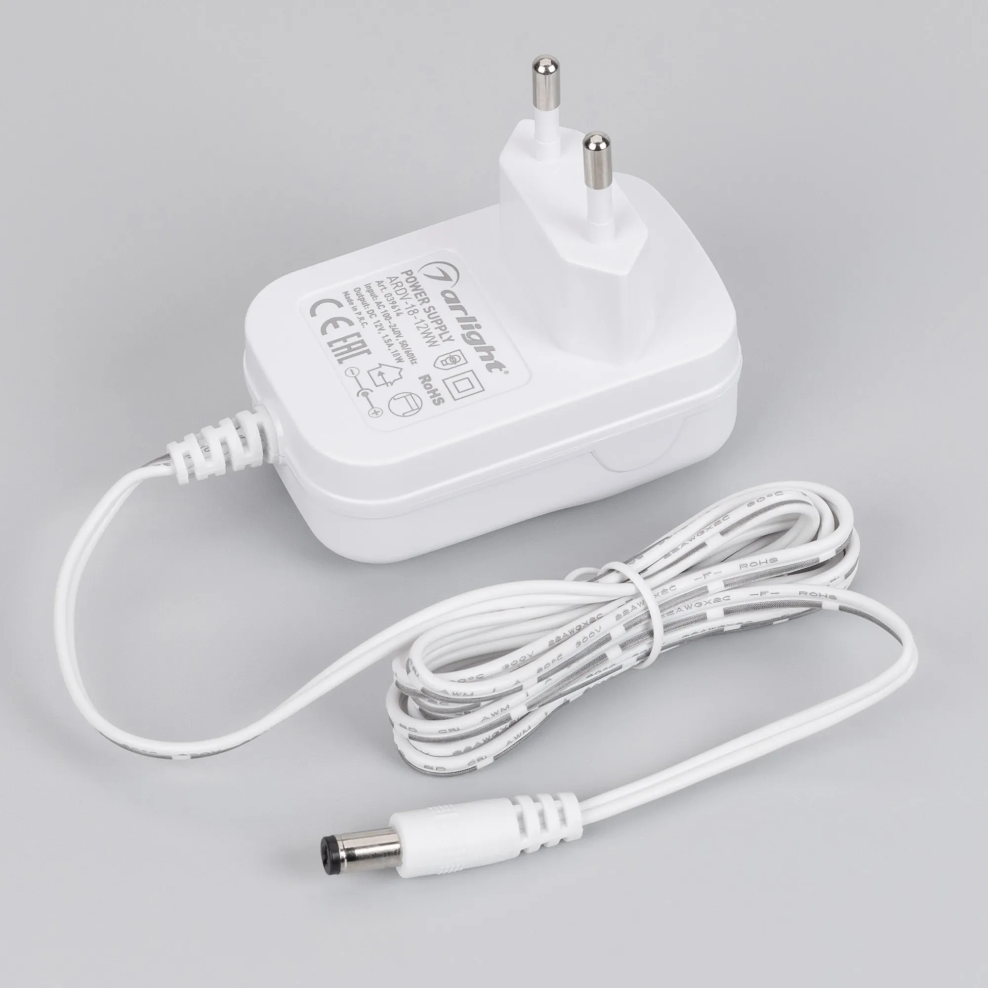 Сетевой адаптер с гальванической развязкой для светодиодных лент 12 В (белый корпус). Мощность 18 Вт. Вход:100-240VAC, Выход: DC12V 1.5A, длина кабеля 1.5 м., коннектор 5.5x2.1x10мм. Размер 69x43x28 мм (размер без вилки). Гарантия 3 года.
