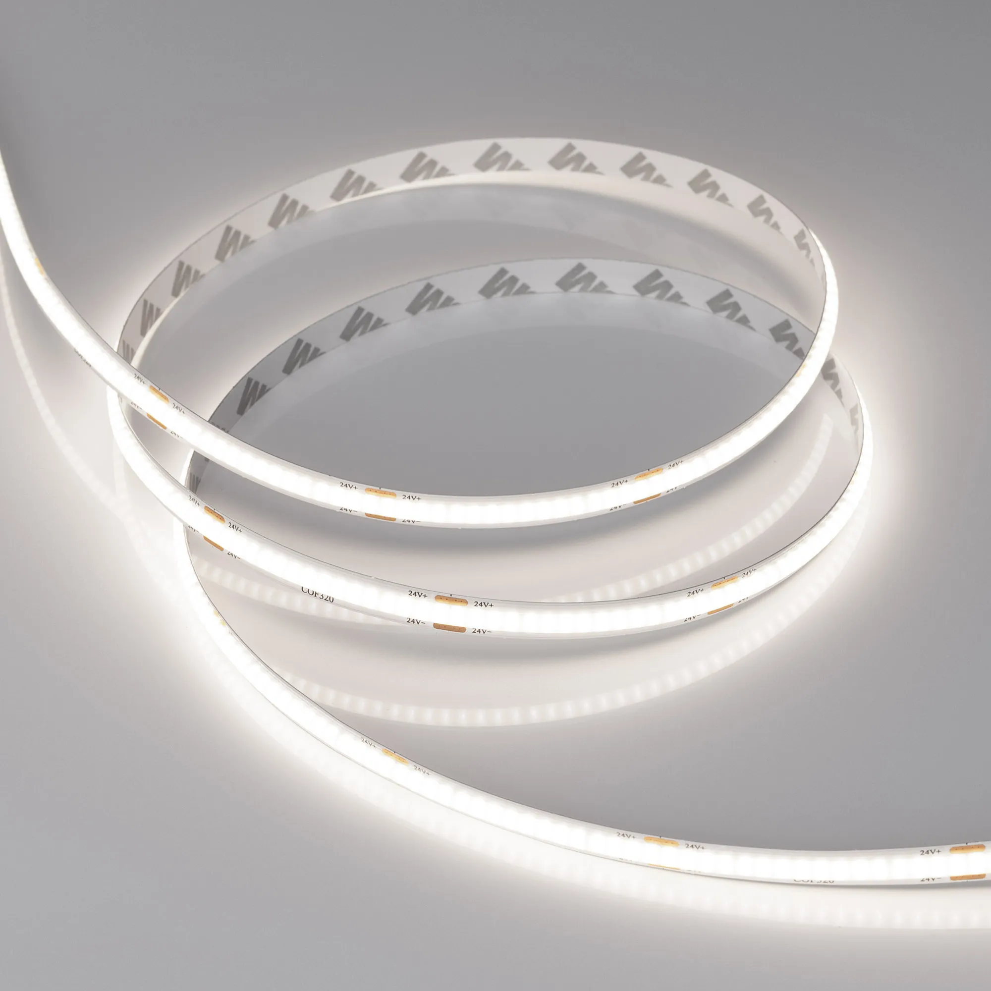 Светодиодная лента сплошного свечения COB серии X320. Светодиоды CSP, 320 шт/м, белая плата шириной 8 мм, скотч 3M. Цвет БЕЛЫЙ 6000K, индекс цветопередачи CRI>90, угол 175°. Питание 24 В, мощность 8 Вт/м (40 Вт на 5 м). Размеры 5000х8х2 мм. Мин. отрезок 50 мм. Цена за 1 м.