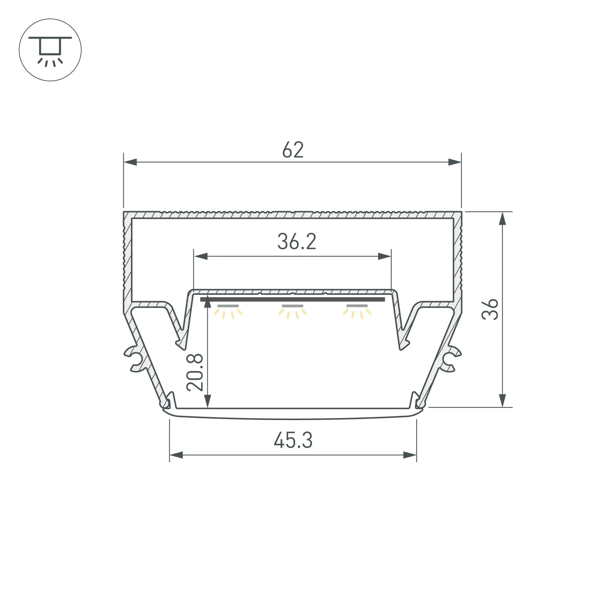 Алюминиевый профиль для натяжных потолков (центральная линия). Решение 2-в-1 - каркас для крепления натяжного потолка и профиль для установки светодиодной ленты. Для дизайнерских решений «линии света» в натяжных потолках. Монтируется к потолку накладным способом. Ширина площадки для ленты 36,2 мм. Длина 2000 мм. Цена за 1 м.