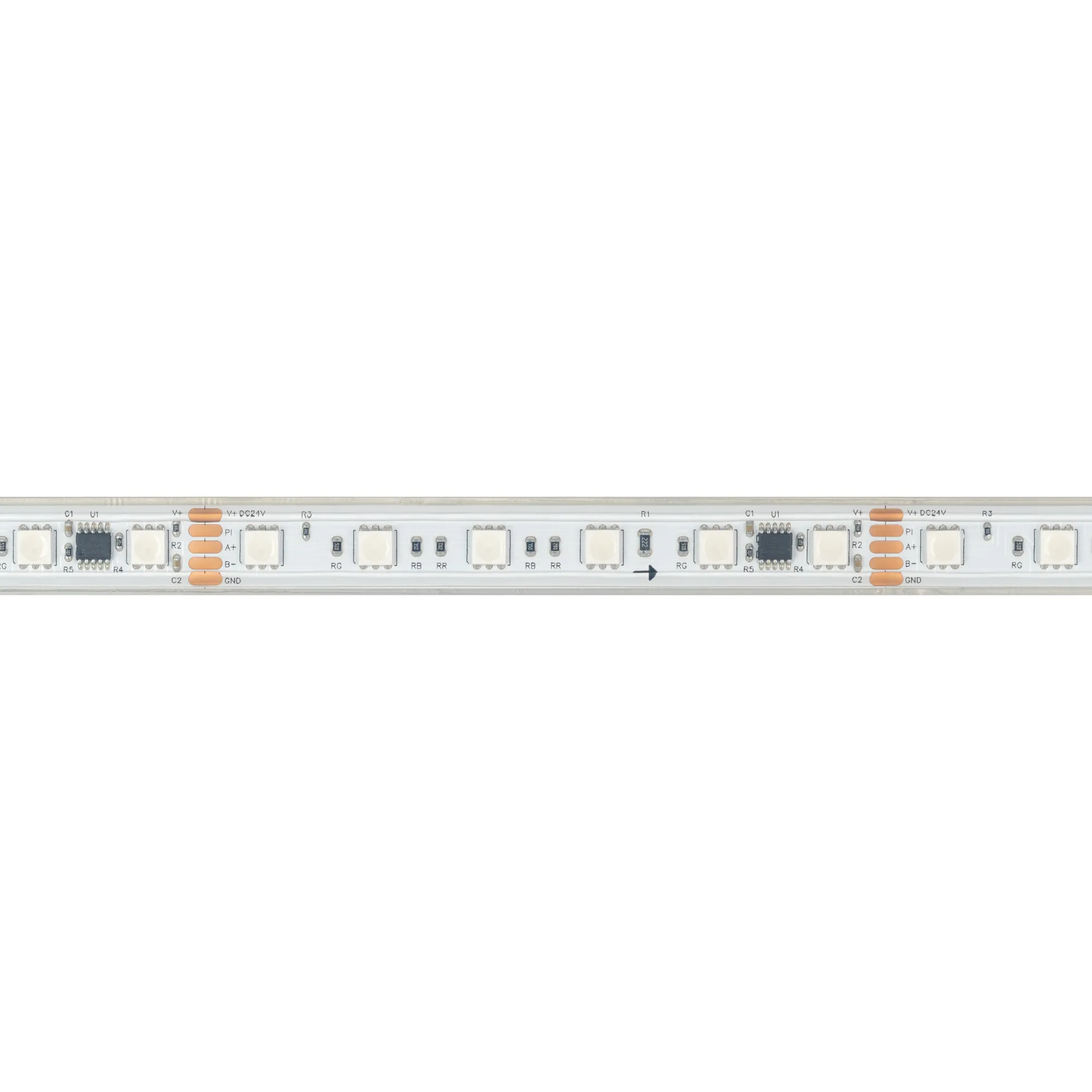 Светодиодная герметичная лента DMX серии B60 с микросхемой TM512AC, IP67 (PS - силиконовая экструзия). Светодиоды SMD 5060, 60 шт/м , 10 pixels на 1 м (50 pixels на 5 м), 1 pixel = 6 светодиодов, белая плата шириной 12 мм, скотч 3M. Цвет RGB, угол 120°. Питание 24 В, мощность 15 Вт/м (75 Вт на 5 м). Размеры 5000x15x5 мм. Мин. отрезок 100 мм, 6 светодиодов. Цена за 1 м.