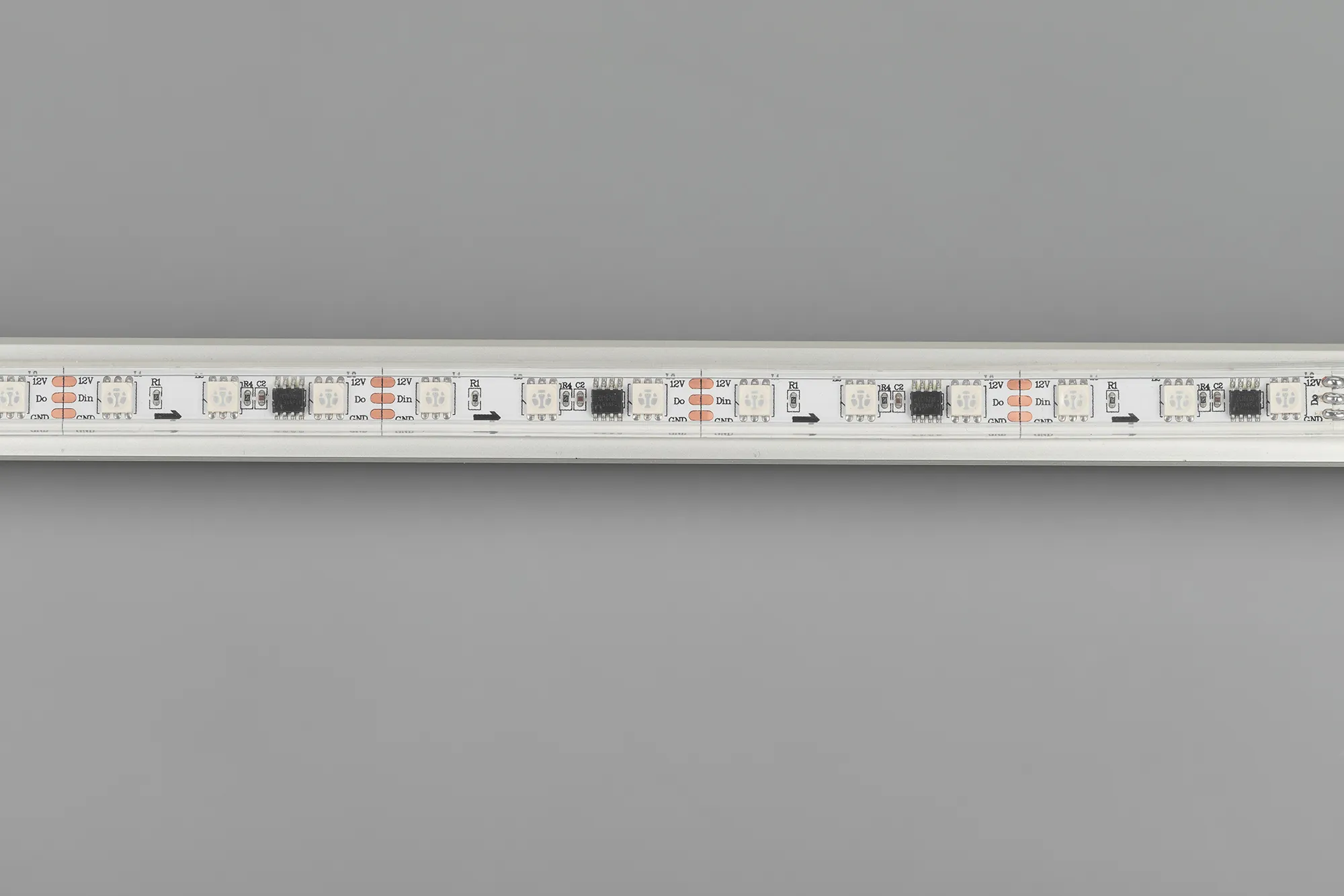 Герметичная лента «Бегущие огни» с драйвером 16703, в прозрачной силиконовой трубке (IP66), со СКОТЧЕМ 3M на обрат. стороне. Рекоменд-ся подводка пит-я с 2 сторон ленты. Длина 5м, 300шт LED RGB 5060, 20 pixel/m (1 pixel = 3 LED). Управление от внешнего контроллера SPI, без авторежима. Питание 12V, макс. мощн-ть 14,4 Вт/м (статический белый цвет). Ширина 12 мм. Герметичные круглые коннекторы.